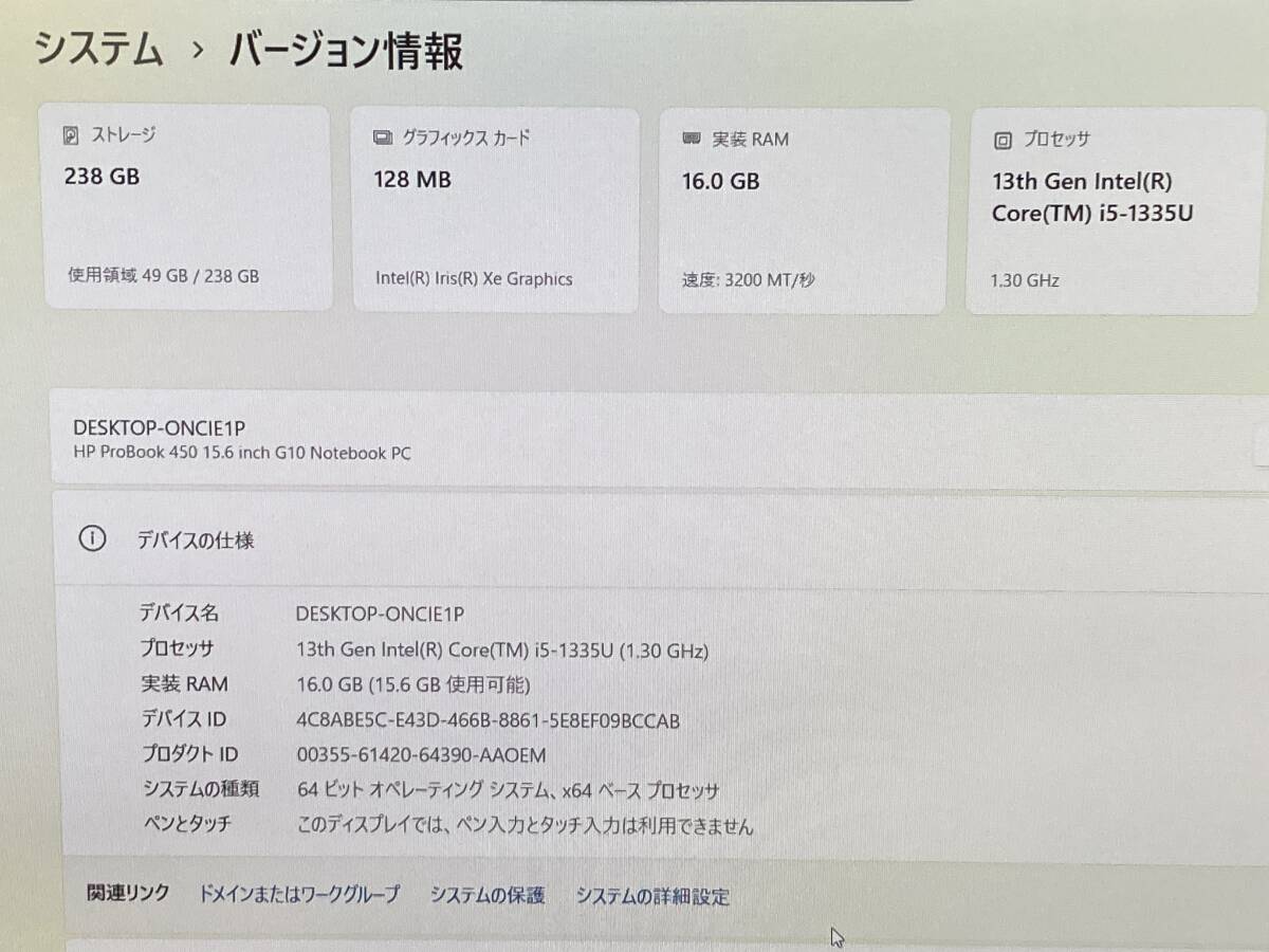 「ジャンク品」HP ProBook 450 G10 / Core i5-1335U 1.30GHz / メモリ16GB / SSD 256GB / Windows11Pro