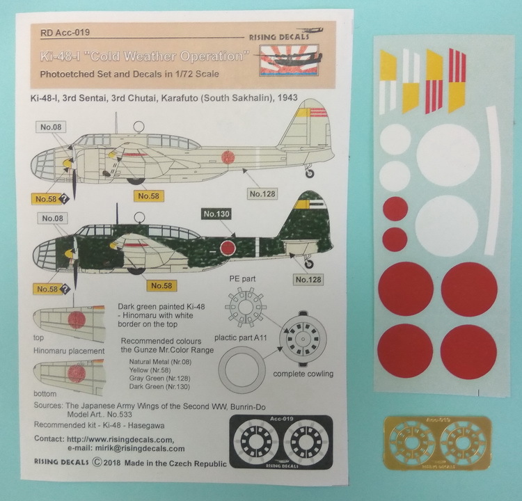 川崎Ki-48-I 九九式双発軽爆撃機のカウリング前面に装備した寒冷地作戦用のエンジン過冷却防止用覆いと、樺太の飛行第3戦隊第3中隊の部隊マークデカールのセットです。真鍮エッチング。1/72スケール用。新品です。Acc-019 | ||
