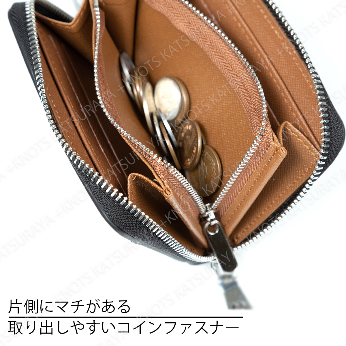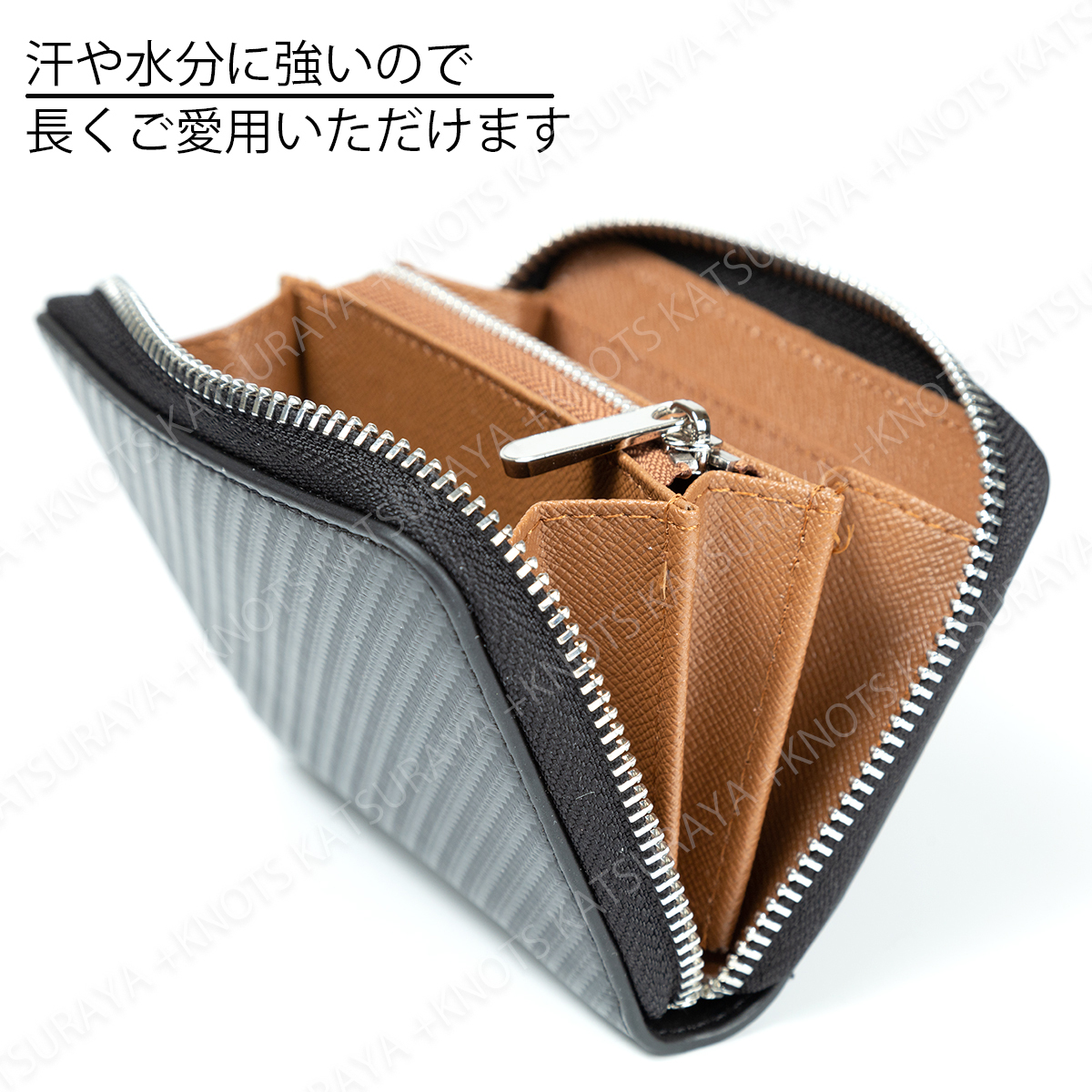 表面は独特な光沢で高級感があるカーボンレザーのミニ財布です。カードポケットが内側に4か所と外側にひとつあり、よく使うカードは外側に入れると便利です。マチのある小銭入れはL字に大きく開きます。