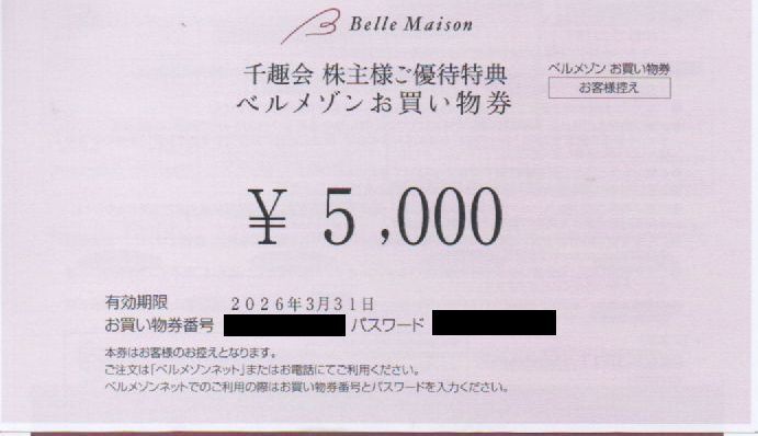 千趣会 株主優待券 5000円分 有効期限:2026年3月31日 番号通知 送料無料