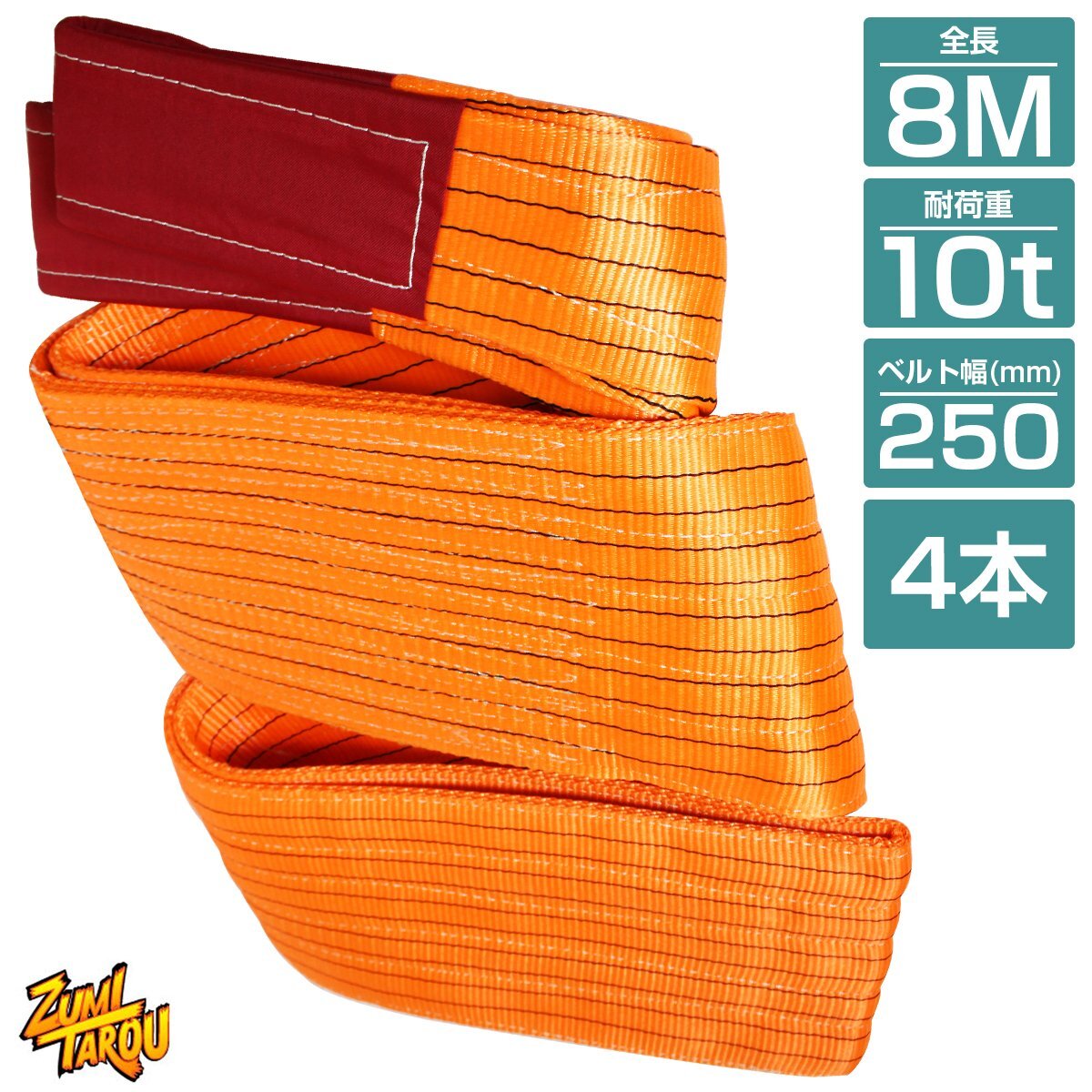 [4本 セット/耐荷10t/長さ 8m] スリング ベルト 吊上げ ナイロン クレーン ロープ 荷吊り 玉掛け 牽引 運搬 10トン 幅250mm