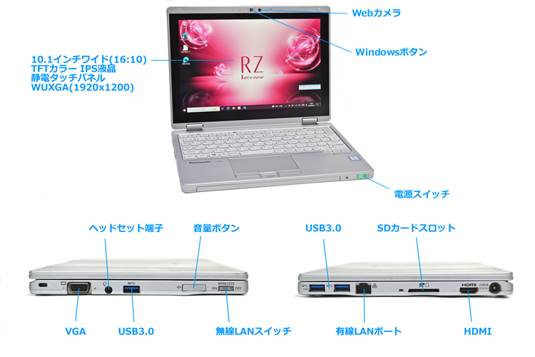 | 液晶 | 10.1型ワイド (16:10) 静電タッチスクリーン TFTカラーIPS液晶 WUXGA (1920×1200ドット) | |
