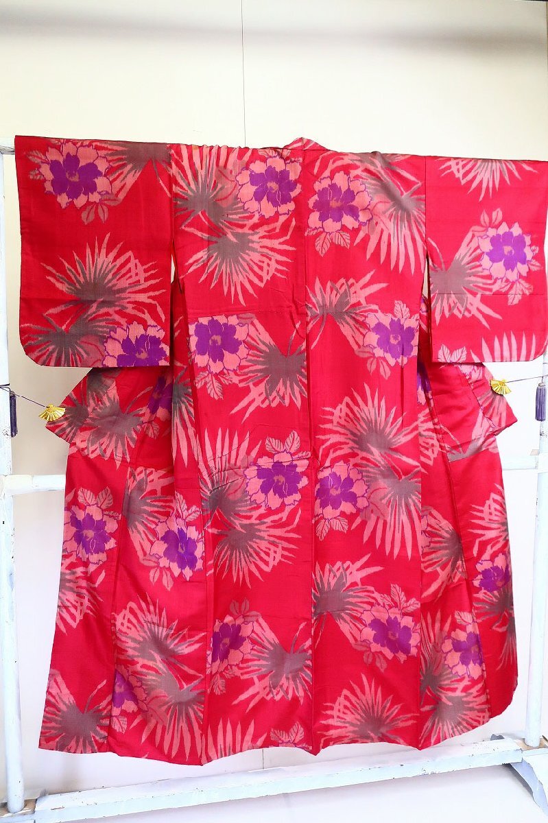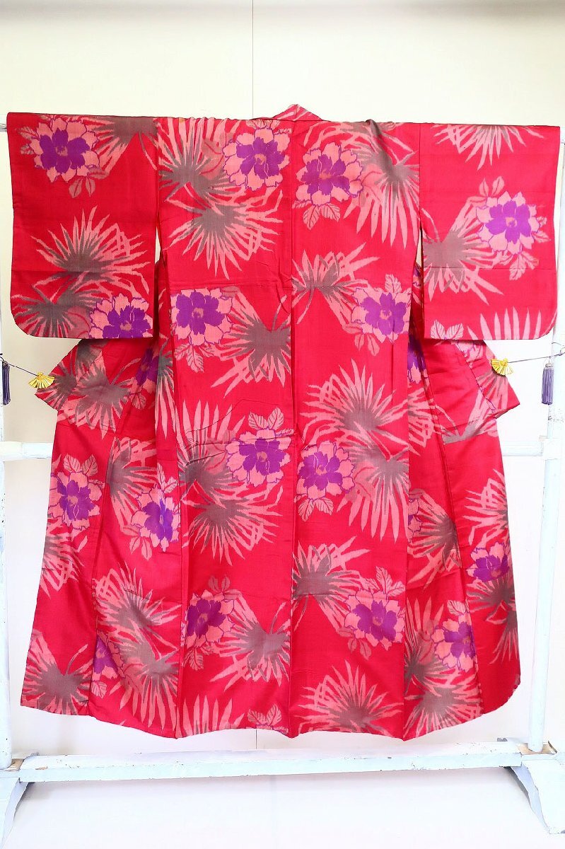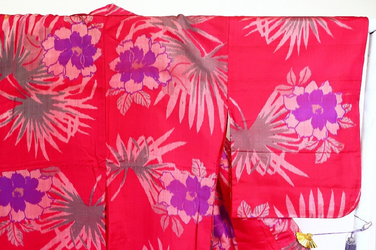 アンティーク 小紋 銘仙 身丈141.0cm 赤ピンク 花文 大正ロマン レトロ 正絹 仕立て上がり kimono 着物フィ 19795 |