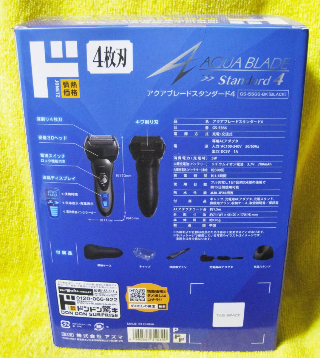 | 商品説明 | ディスカウントショップ ドン・キホーテの4枚刃電気シェーバー アクアブレードスタンダード4 品番GS-5566-BK の未使用未開封品を出品いたします。 こちらの出品物の本体カラーはブラックです。 こちらの商品についての詳細はアップしたパッケージ画像やドンキ・キホーテの商品紹介ページ https://www.donki.com/j-kakaku/product/detail.php?item=4418 などでご確認下さい。 外箱パッケージには若干のイタミがある場合がございますが全くの未使用未開封品なので安心してお使いいただけると思います。 発送方法は以下のいずれかからお選び下さい。 ※レターパックプラス(送料600円・追跡可・実名配送・発送からお届けまで速達郵便同等のスピード・配達員による対面渡し) ※おてがる配送宅急便60サイズ(送料は下記料金表をご確認下さい・追跡可・匿名配送・発送からお届けまで通常の宅急便同等のスピード・補償付き) |
