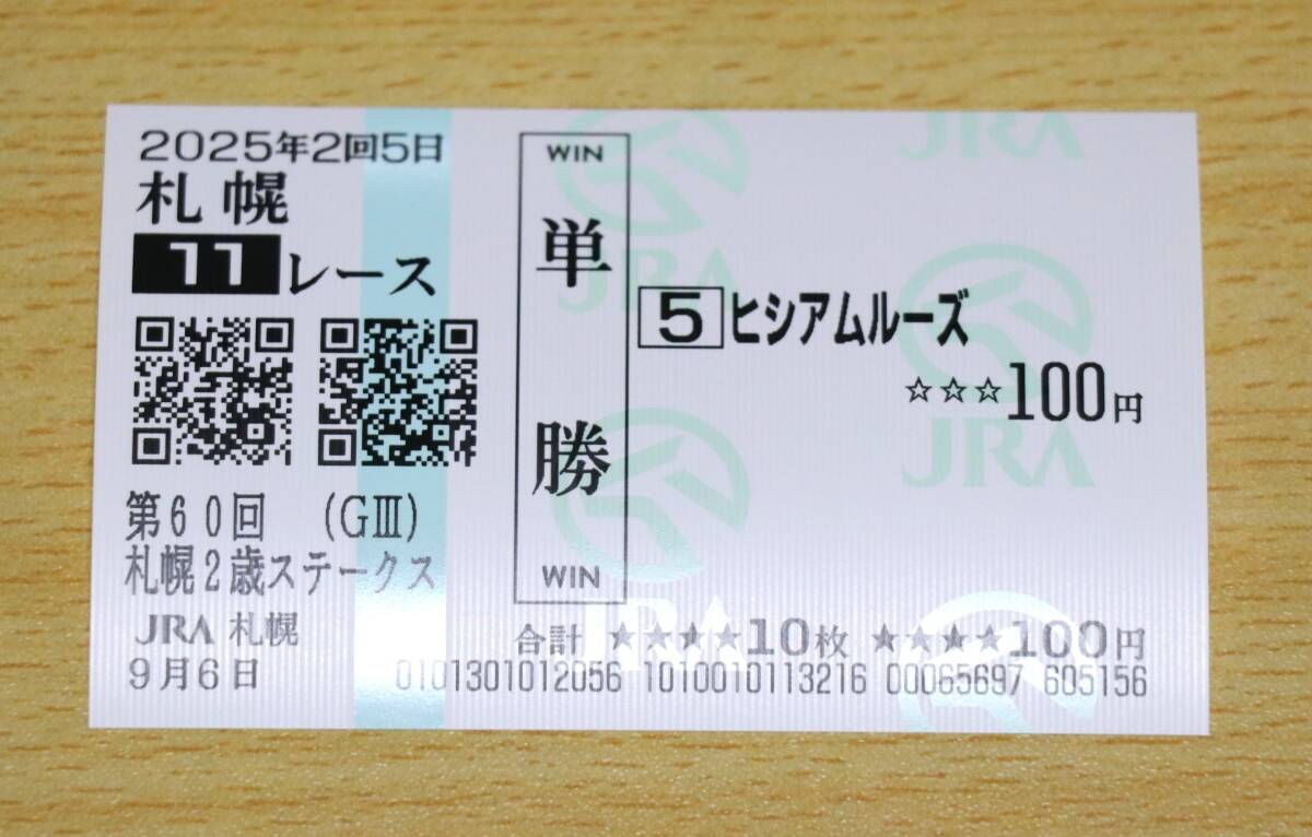ヒシアムルーズ 札幌 11R 札幌2歳ステークス (2025年9/6) 現地単勝馬券(札幌競馬場)です。気に入って頂けた方の落札を心よりお待ちしております。 商品は定型郵便(110円)又は又はゆうパケットポストminiで発送となります。 厚さの関係上、定型郵便の場合は片面段ボール補強、ゆうパケットポストの場合は両面段ボール補強となります。どうかよろしくお願い致します。