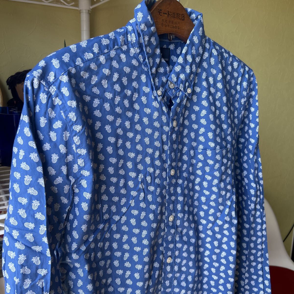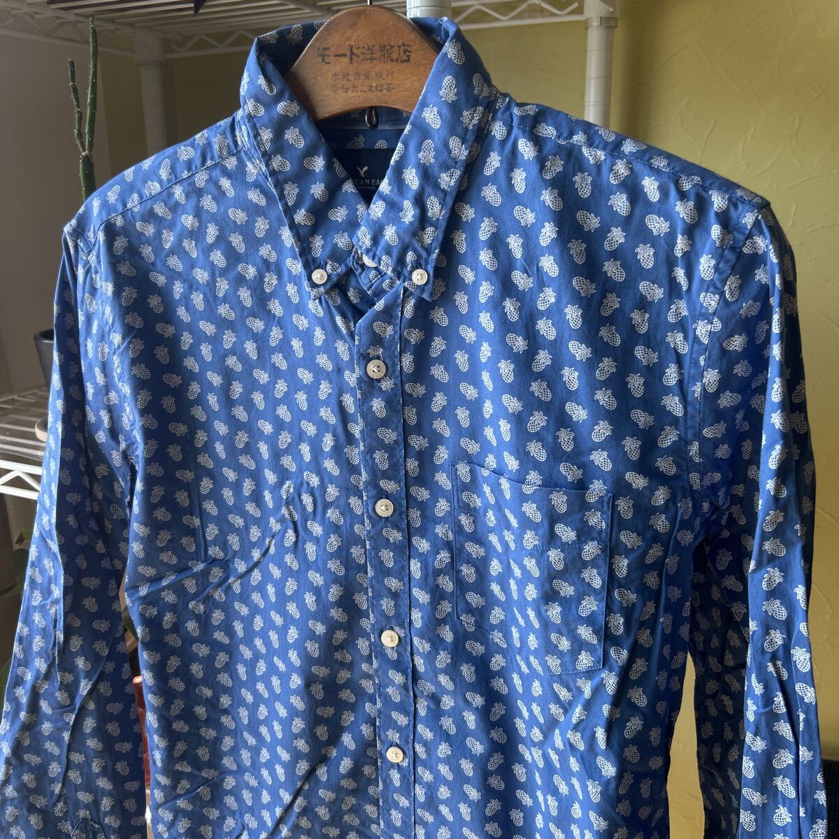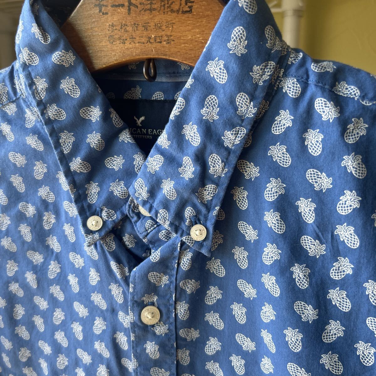 袖丈50(脇下縫目〜袖先端)多少の誤差はお許しください。良い雰囲気です。張りがある綿100 青 パイナップル ボタンダウン アロハシャツ できる限りダメージは説明させていただきますが、こちらが気づかない程度のわずかなしみ、よごれ、