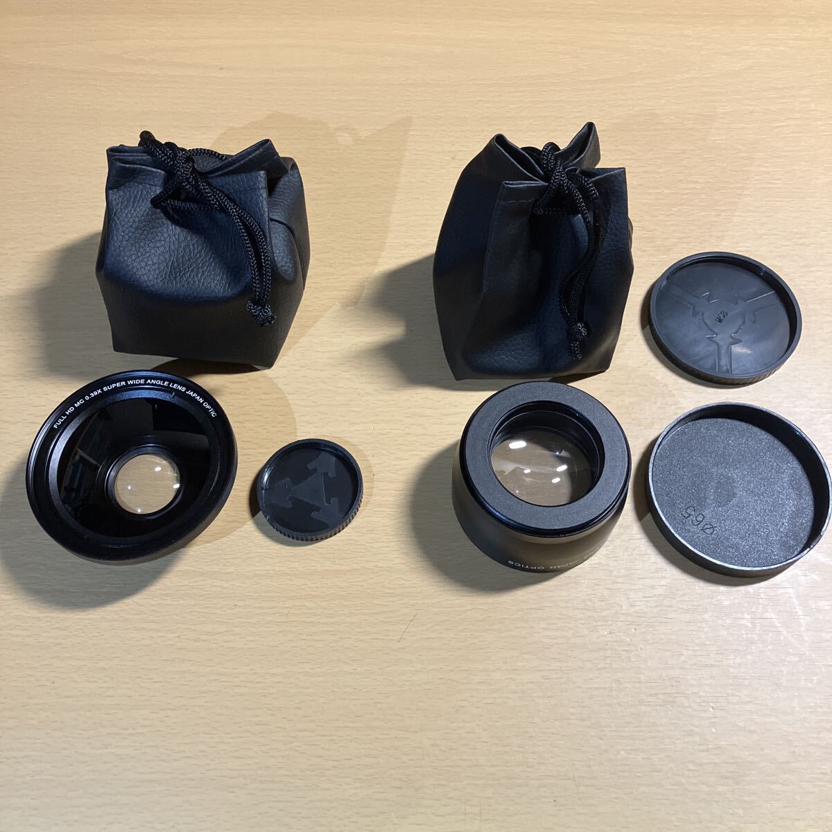 ビデオカメラ、一眼レフカメラ用テレコンバージョンレンズ(×2)、ワイドコンバージョンレン(×0.39)のセットを出品いたします。