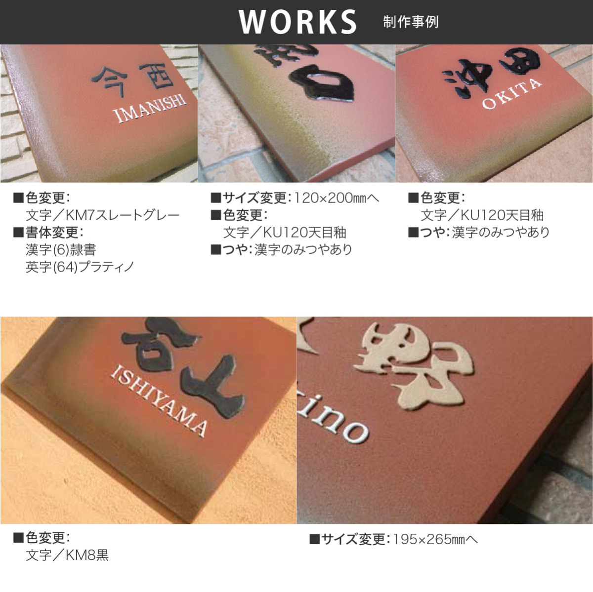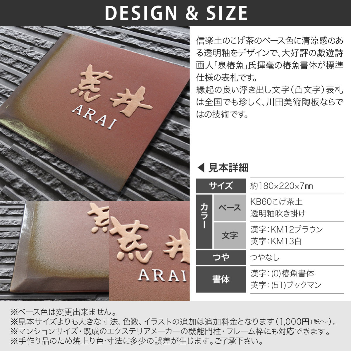 | 商品詳細 | 信楽土のこげ茶のベース色に清涼感のある透明釉をデザインで、大好評の戯遊詩画人「泉椿魚」氏揮毫の椿魚書体が標準仕様の表札です。縁起の良い浮き出し文字(凸文字)表札は全国でも珍しく、川田美術陶板ならではの技術です。 |