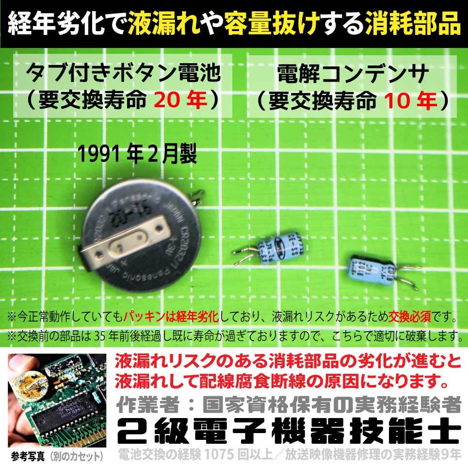 要交換寿命10年の電解コンデンサは電解液蒸発で容量抜けすると、電圧供給を不安定にし映像音声にノイズを発生させます。電池電圧が規定値以下になると、記録が消えセーブもできなくなります。どちらも液漏れすると基板を腐食させるリスクがあります。この商品は電解コンデンサと液漏れガード付き特殊電池を正しい工程・温度・加熱時間の半田溶接で交換しセーブ機能復活!寿命延長!劣化した端子を独自技法でピカピカ高温研磨することで一発起動から5回連続起動テストに合格しています。