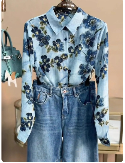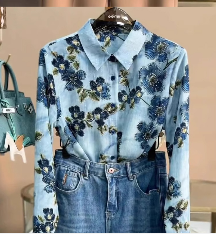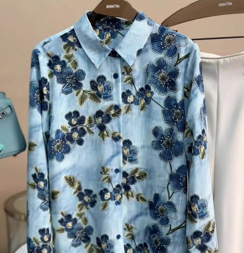 レディース花柄ブラウスブルー系L