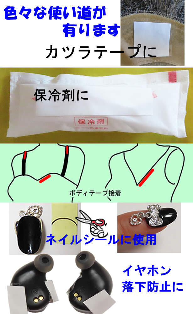 皮膚貼付用両面テープ 3M製品 ISO-10993に基づく、広範囲な安全性が確認されてます。 ●細胞毒性試験 ●急性初期皮膚刺激試験 ●皮膚刺激試験 ●皮膚感作性試験等 |