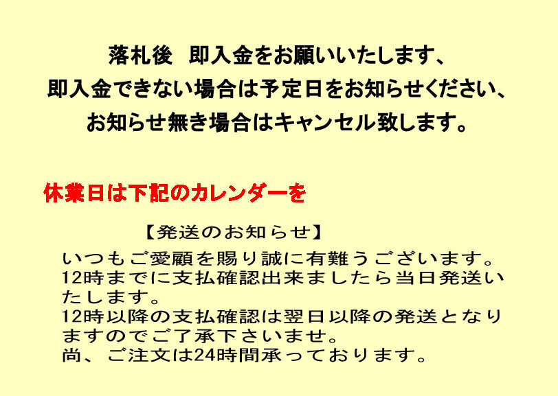 【送料無料】 郵便受箱(ポスト)へ配達いたします。 ※紛失・破損の保障はありませんので予めご了承ください。 ・追跡あり。 ・定休日は下記のカレンダーをお願いいたします。 ★商品の性格上評価は入れません、ご希望の場合は連絡をください |