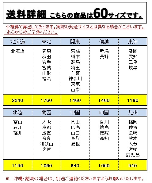 【送料に関して】 下記料金は佐川急便、クロネコヤマトの契約運賃でお安い方を掲示しております。 発送方法は、当方にて判断させていただいております。 もし、運送方法をご指定になる場合は、発送料金がお高くなる場合がありますので、 ご了承ください。 |