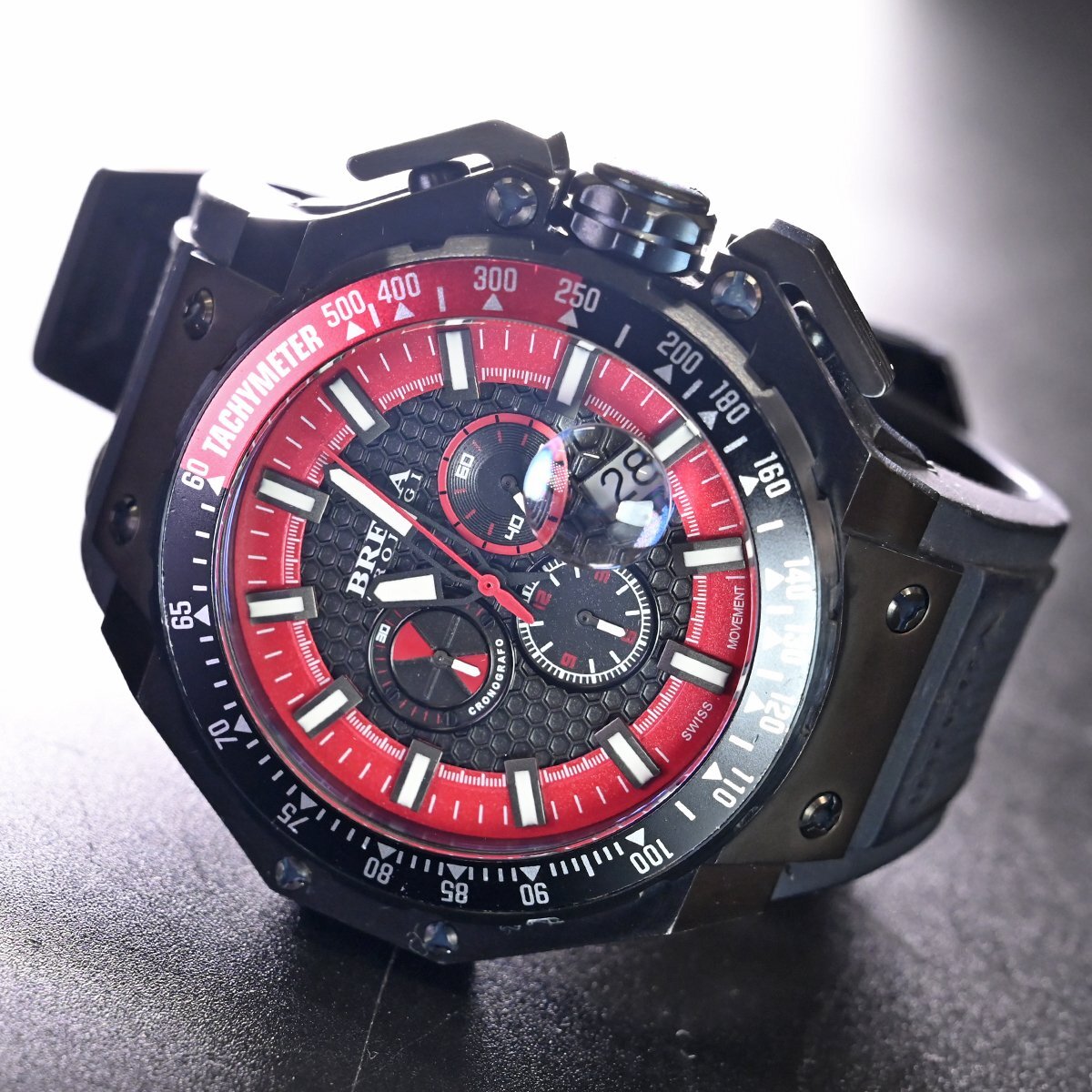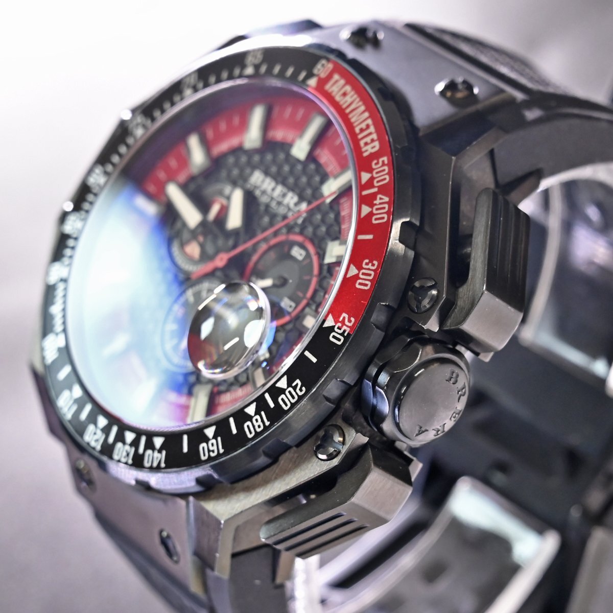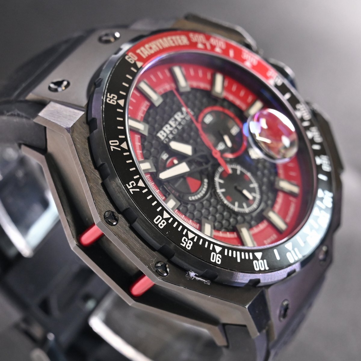 ブレラ・オロロジの54mm グランツーリスモ クロノグラフです。 古くから芸術やファッション性の富むこの地で、時計業界に30年におよぶ経験を生かし、革新的なデザインとクラフトマンシップを融合した作品を制作しています。 54mmもの巨大なスティールケースにブラックのタキメーターベゼルが相まってラグジュアリーカーレースのイメージを演出。 ペダル型のプッシュボタンやフロントグリルを連想させるダイアル等、イタリアブランドならではの細かな意匠と配色がモダンな逸品です。 ※基本動作確認済。 |