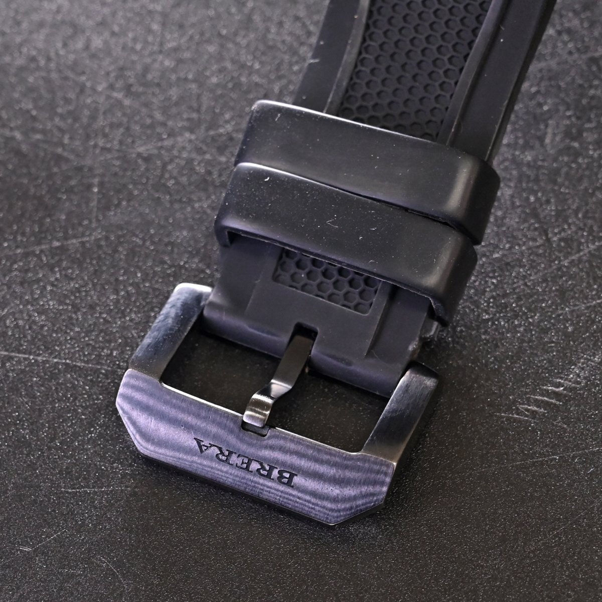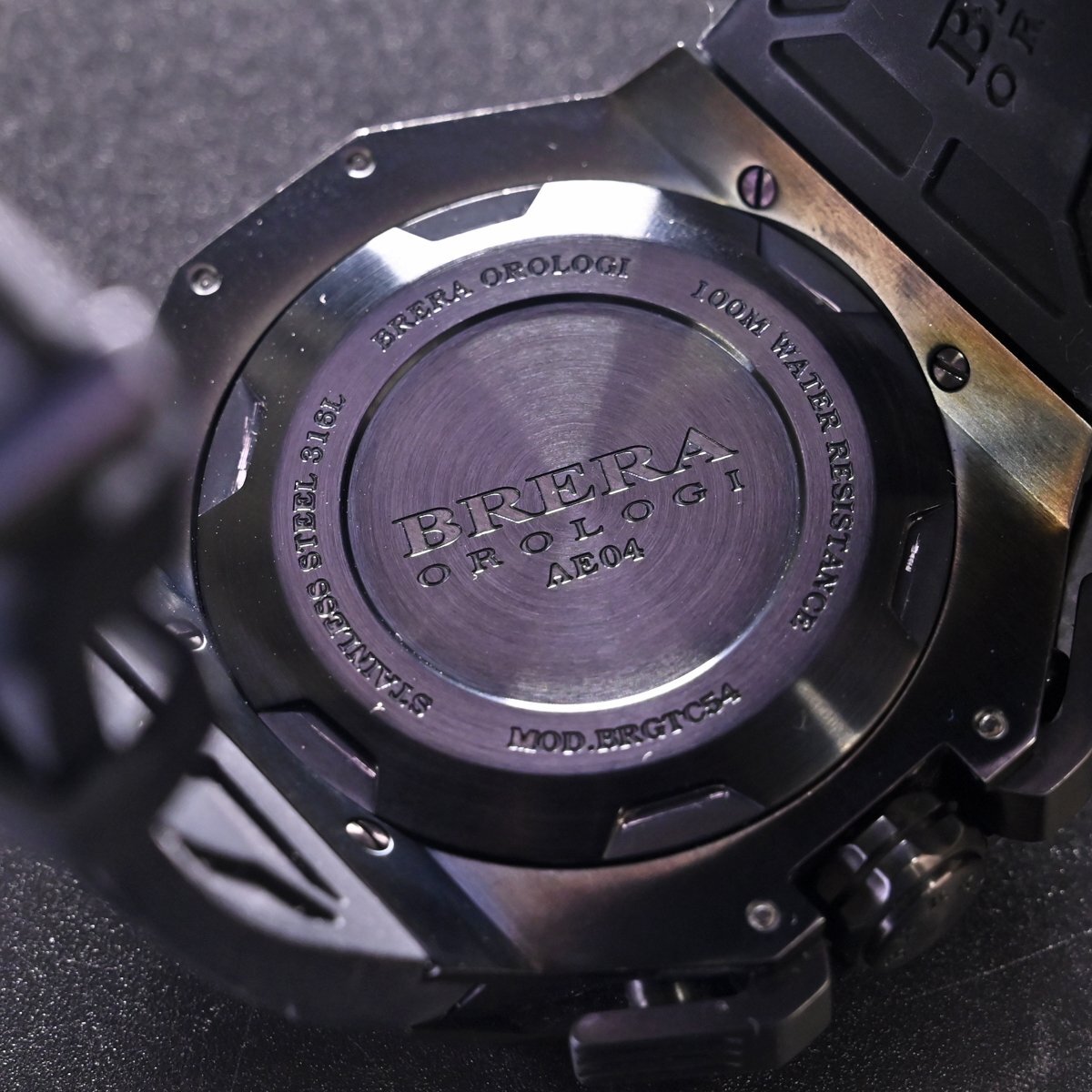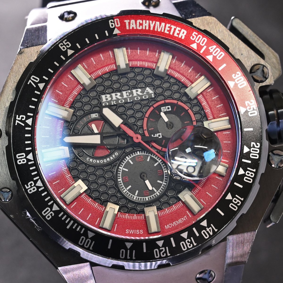 ブレラ・オロロジの54mm グランツーリスモ クロノグラフです。 古くから芸術やファッション性の富むこの地で、時計業界に30年におよぶ経験を生かし、革新的なデザインとクラフトマンシップを融合した作品を制作しています。 54mmもの巨大なスティールケースにブラックのタキメーターベゼルが相まってラグジュアリーカーレースのイメージを演出。 ペダル型のプッシュボタンやフロントグリルを連想させるダイアル等、イタリアブランドならではの細かな意匠と配色がモダンな逸品です。 ※基本動作確認済。 |