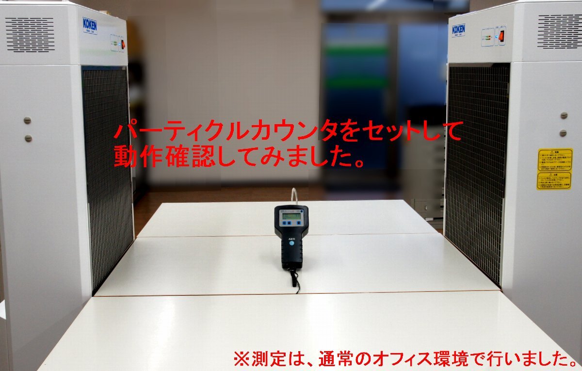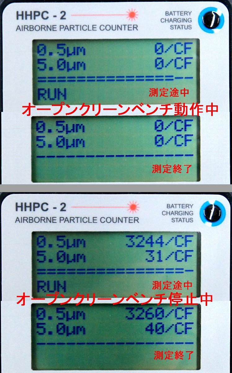 ■電源が入り、定格風速で風が出ることを確認しました。 運転時のランプ状態は写真でご確認ください。 フィルタの差圧レベルは、使用可能な状態(緑ランプ)です。 詳細は写真でご確認ください。 ■パーティクルカウンタを使用して動作確認 机の両サイドにオープンクリーンベンチをセットし、中央部にパーティクルカウンタを置いて空気の状態を測定してみました。 オープンクリーンベンチ動作中と停止中の状態で測定しました。 詳細は写真でご確認ください。(パーティクルカウンタの測定途中のデータと測定終了時のデータを載せてあります) ■当店では、上記以外の動作確認は行っておりません。 | ||||||||
