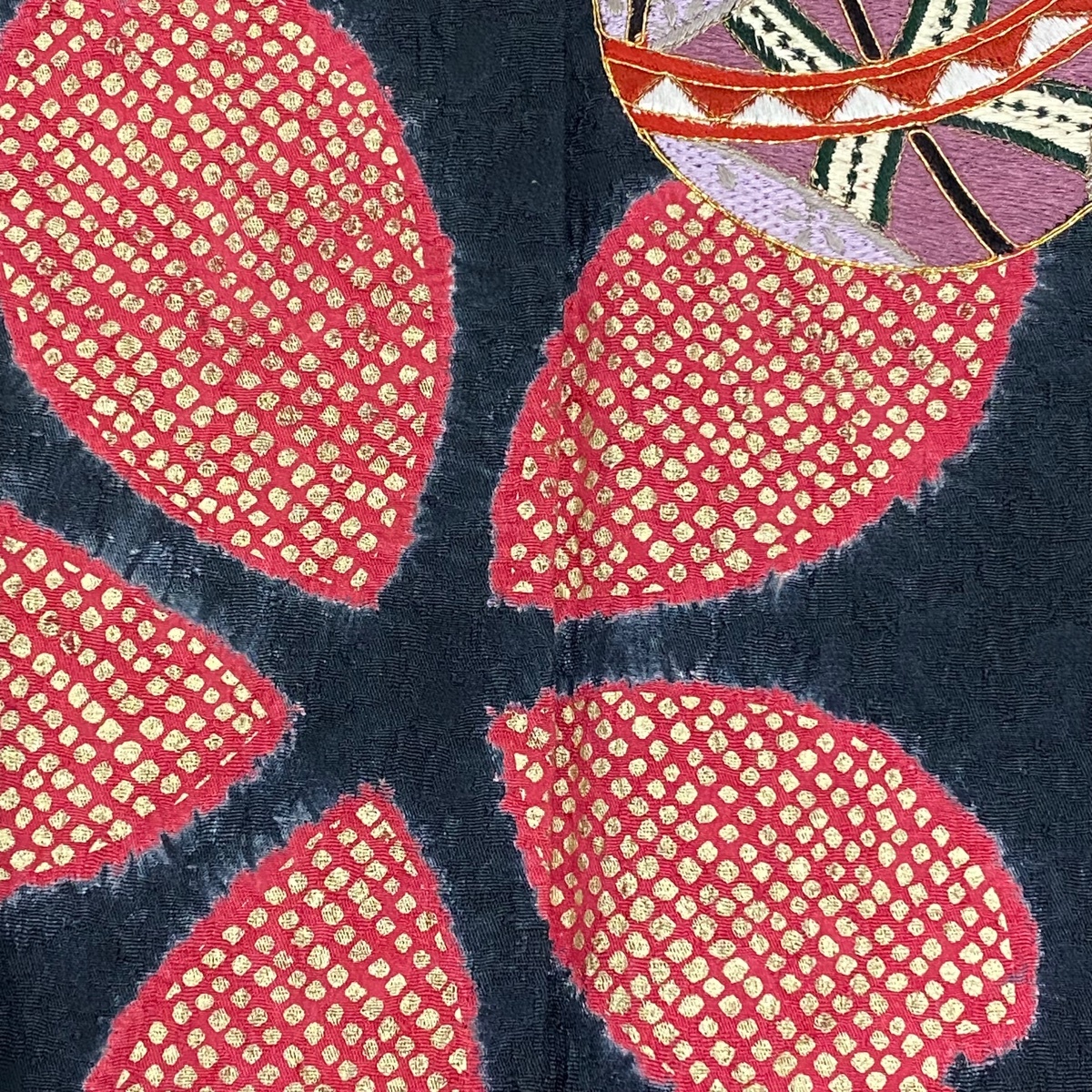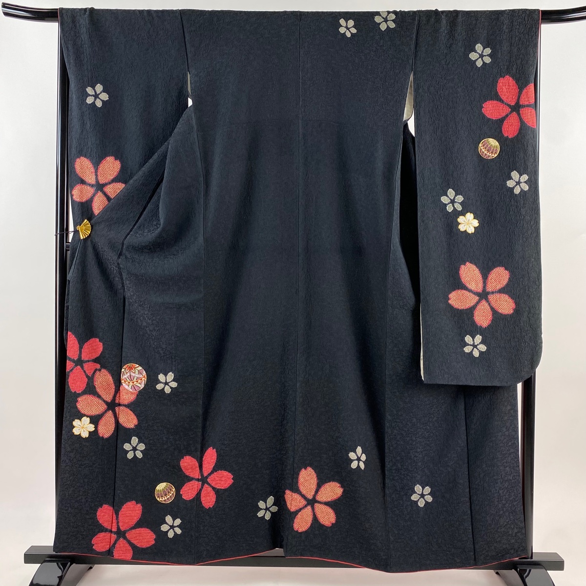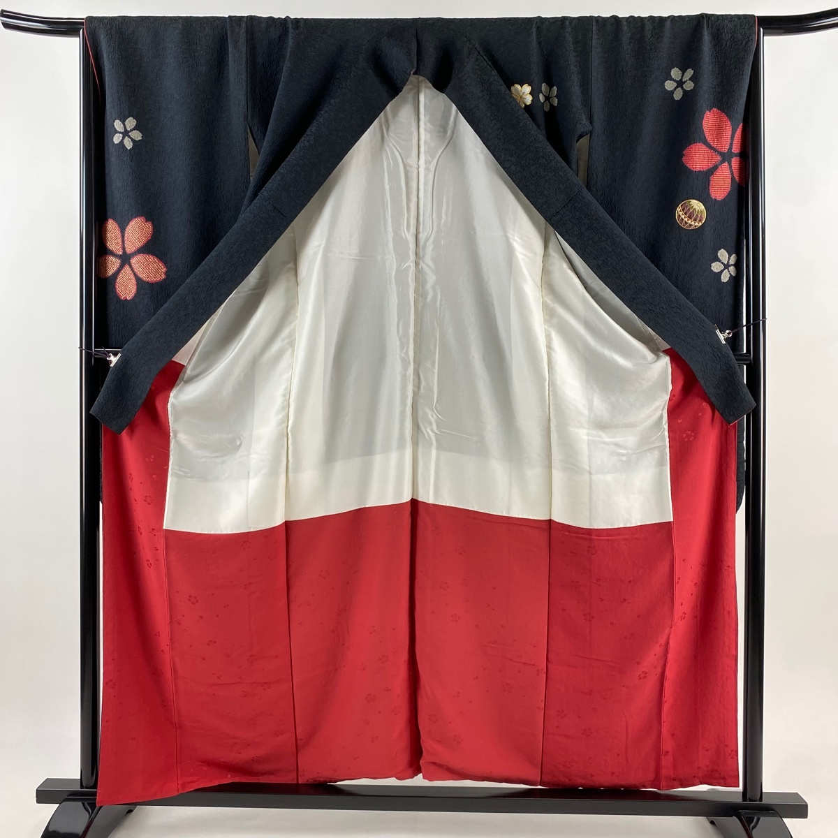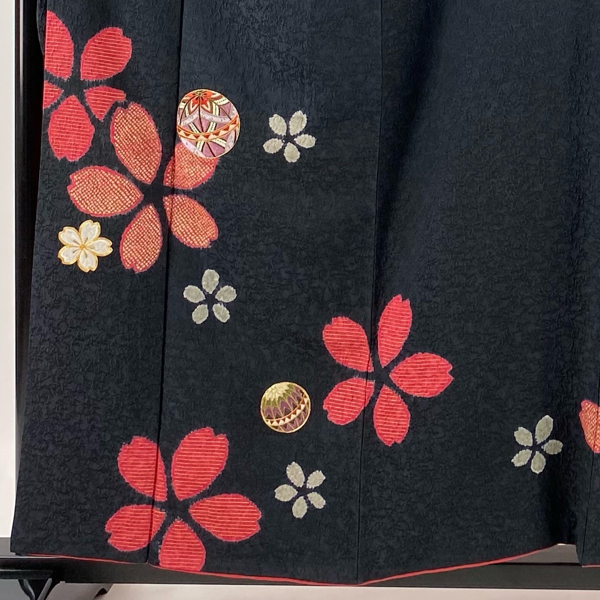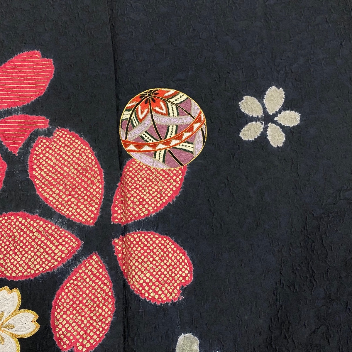振袖 秀品 手鞠 桜 刺繍 絞り 墨色 袷 身丈156.5 裄丈67.5 L 正絹 【中古】 |