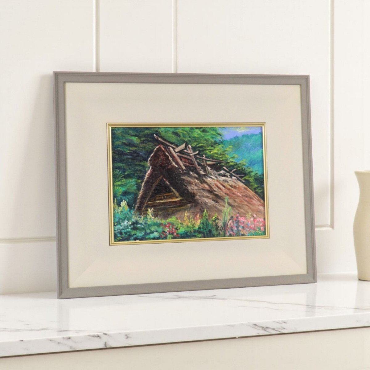 自然に囲まれた茅葺き屋根の廃屋が描かれ、