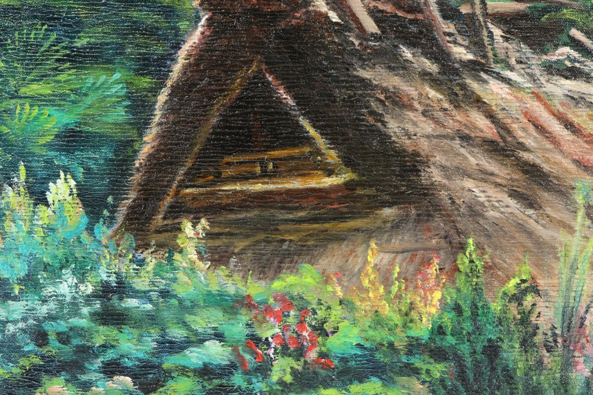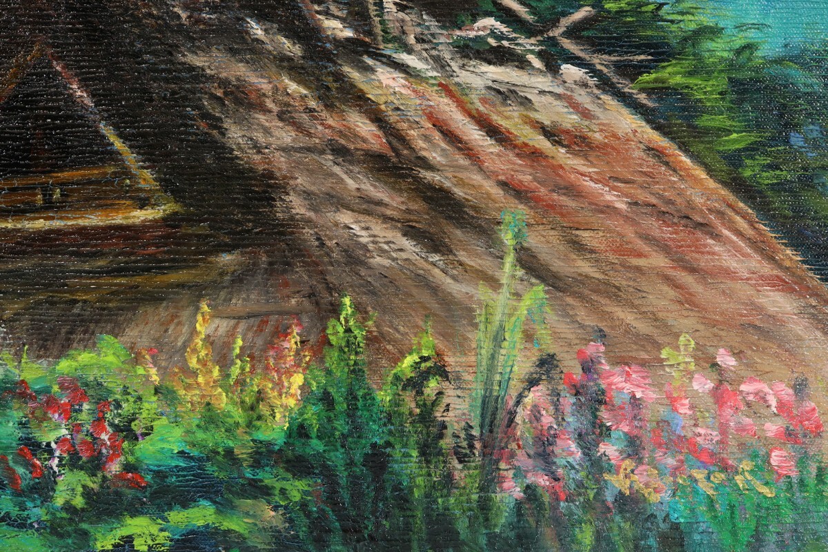 真作 小阪謙造 1993年油彩「廃屋 猪名川にて」画寸 36×27cm 大阪府出身 元旺玄会会員 鮮やかな色彩 自然に囲まれ静かな郷愁を感じる 11411