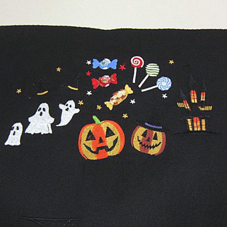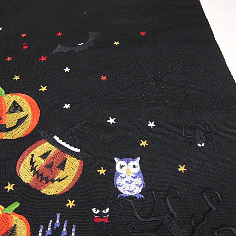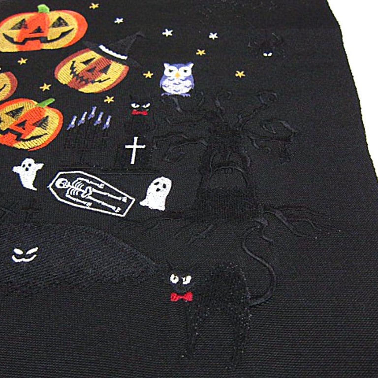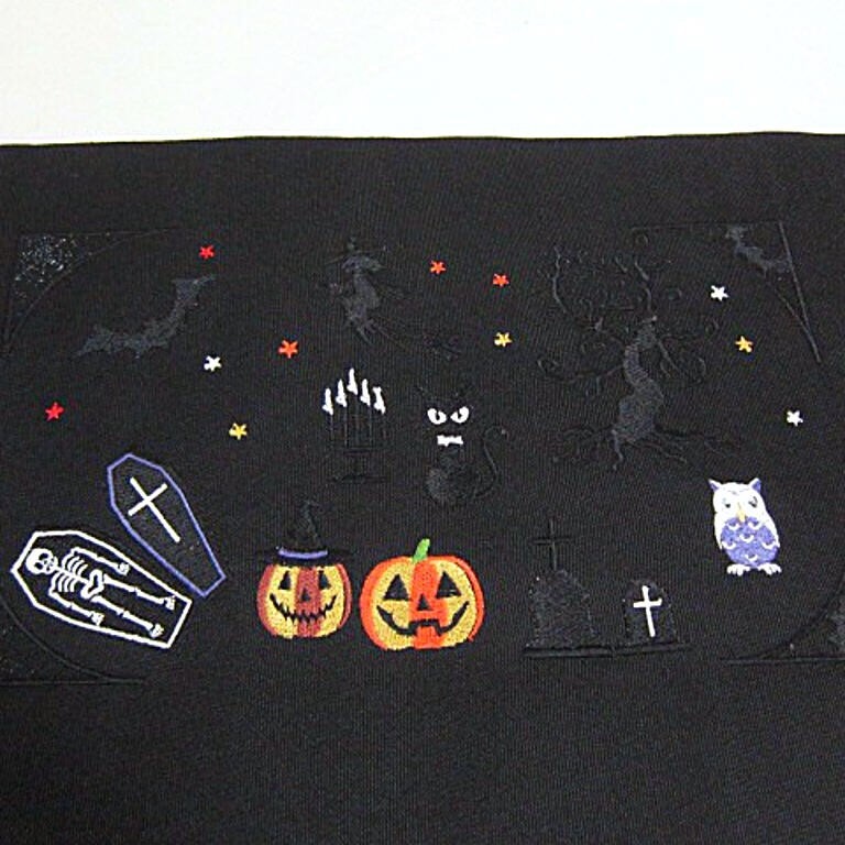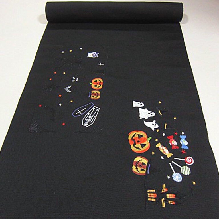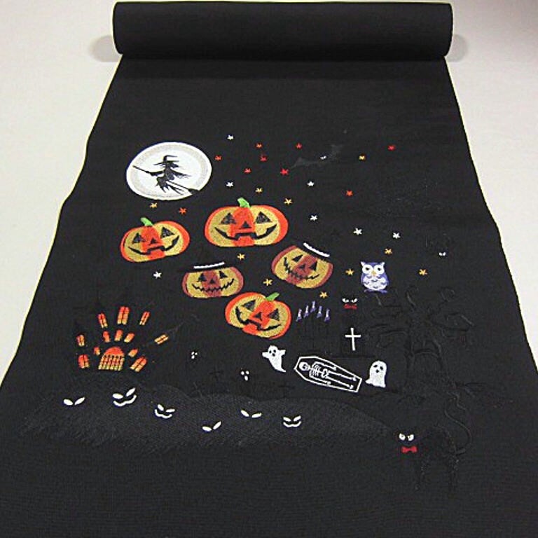 新品未仕立 西陣織刺繍九寸名古屋帯 です。シックな黒のお色目の帯地にハロウィンの意匠が刺繍で表現されております。織り上がったばかりのお品です。お出かけ・パーティーなどにいかがでしょうか