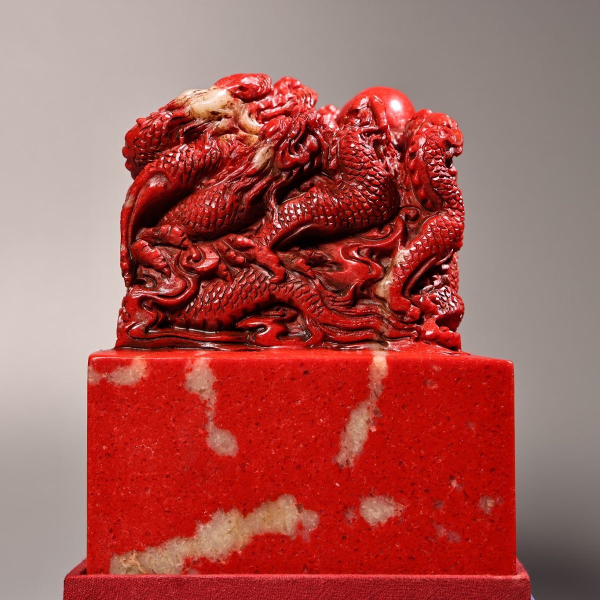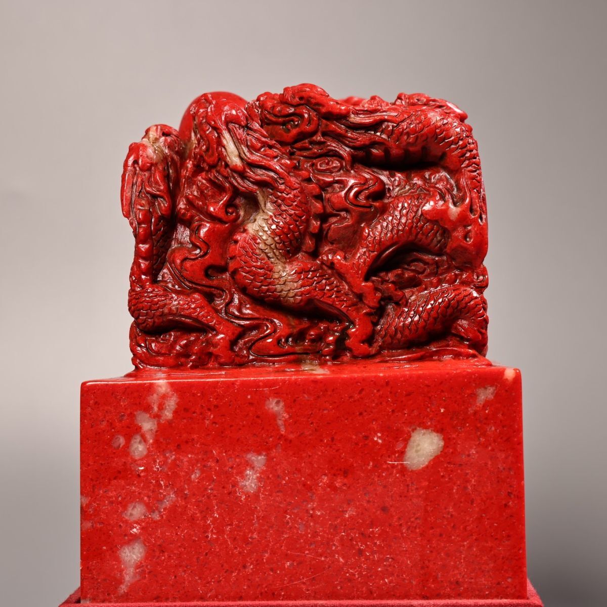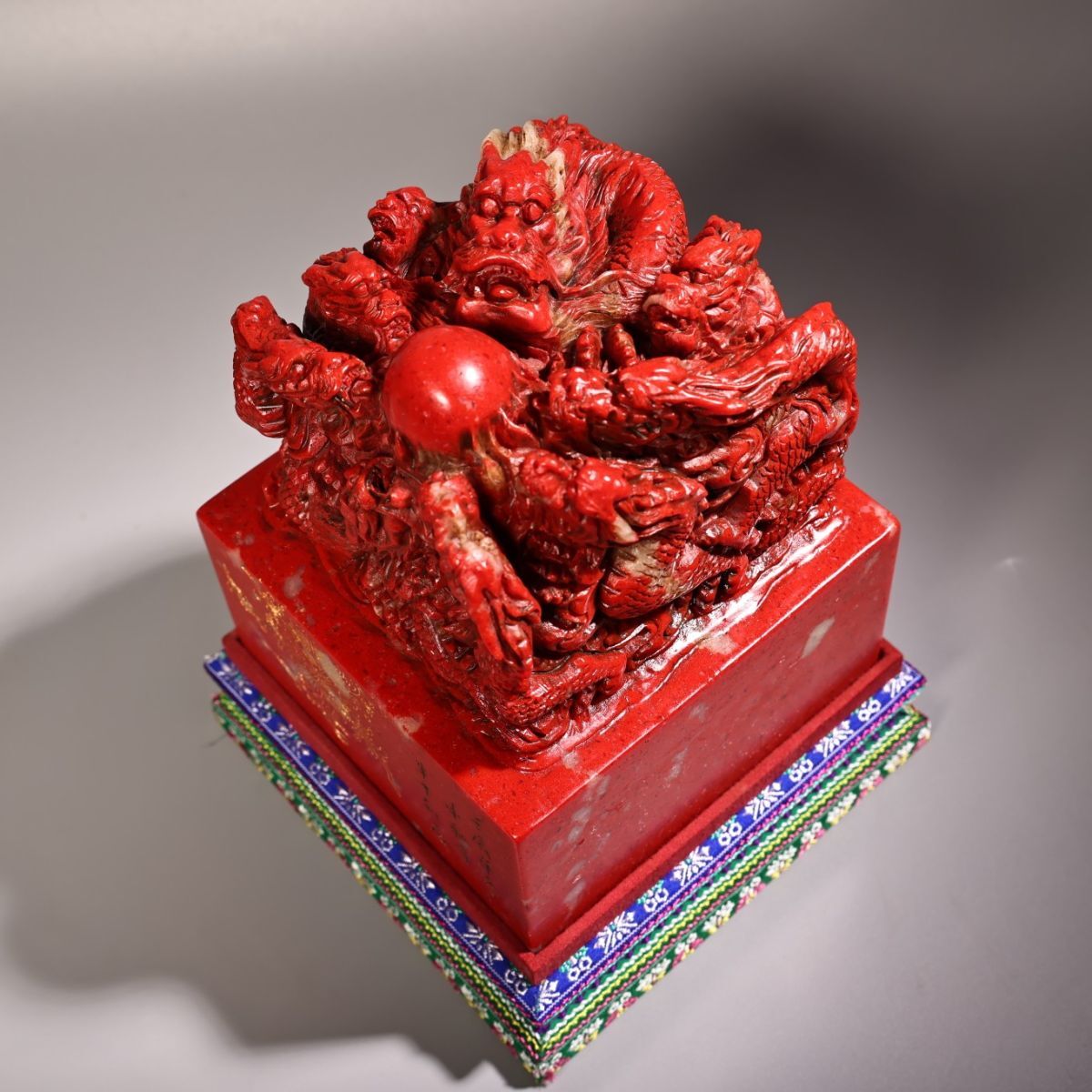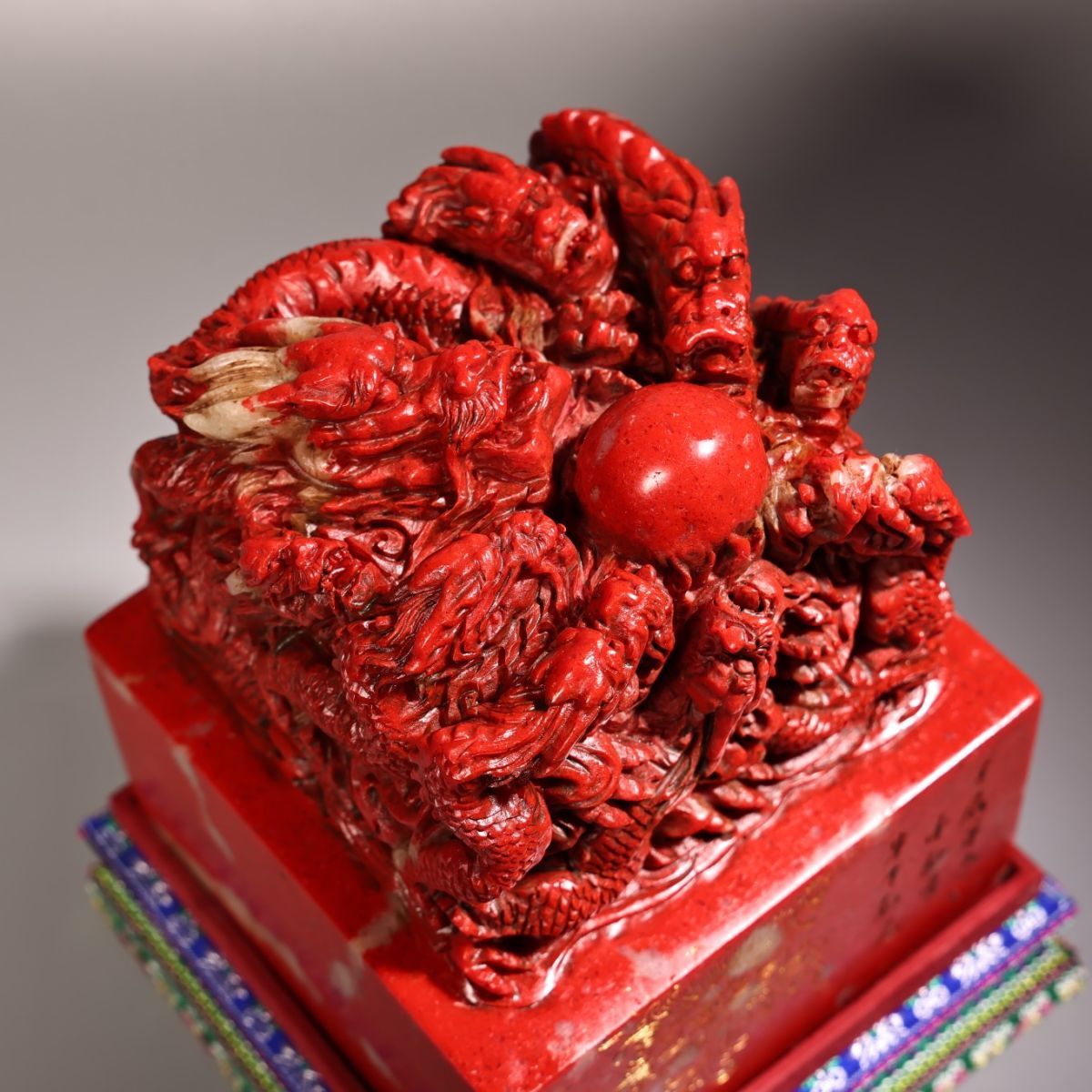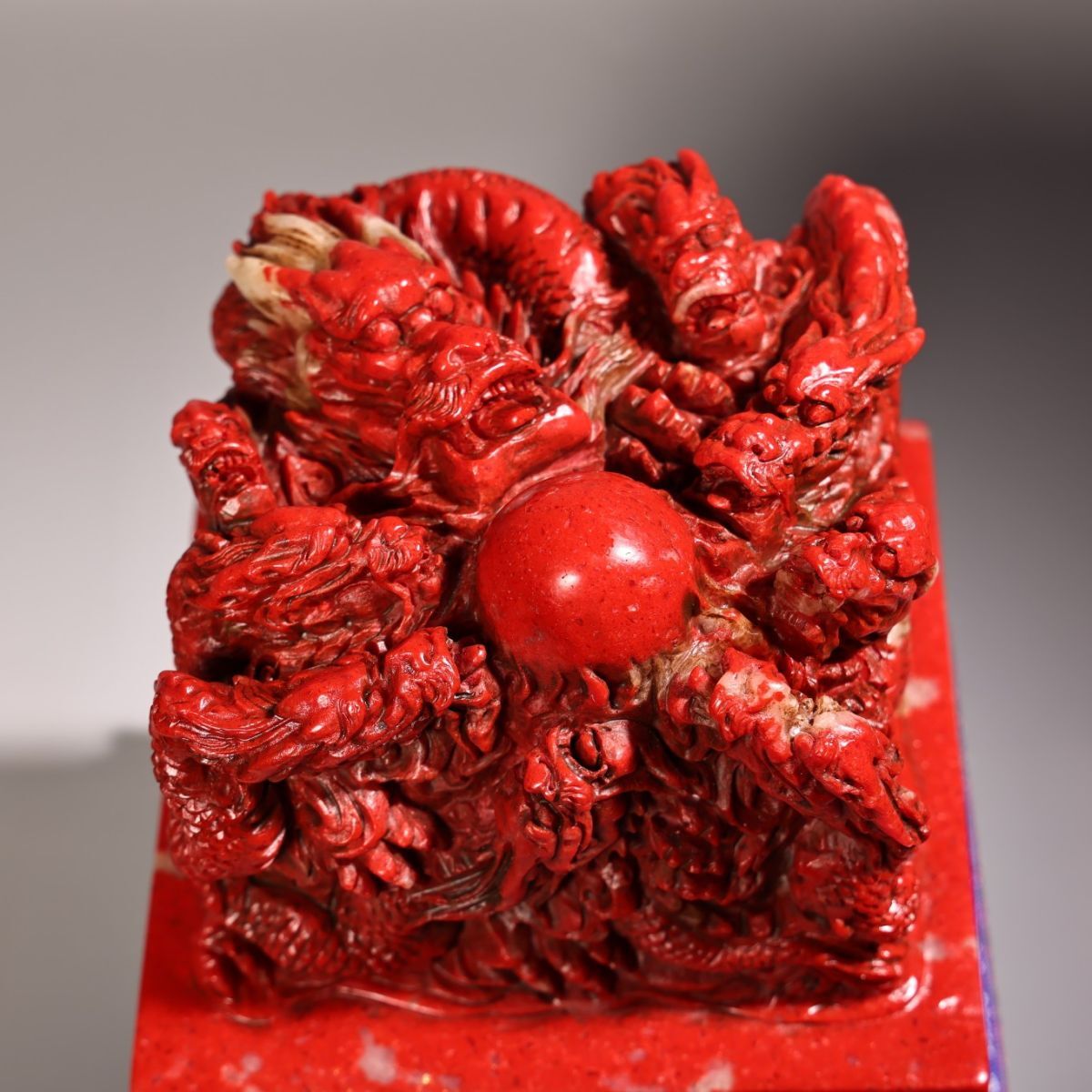 永し 清時代 大紅袍 鷄血石彫 九龍戲珠鈕 手彫り 印章 印鑑 印璽 極細工 置物擺件 古美術品 時代物 古董品 収集 古美味 旧家蔵出 中国唐物