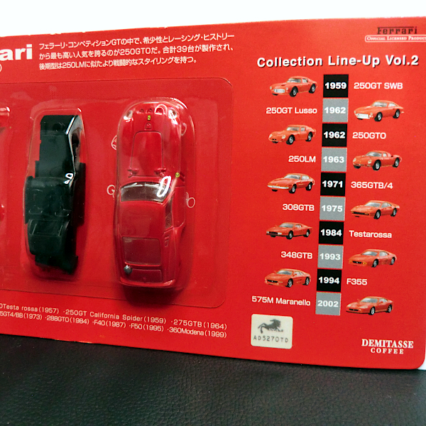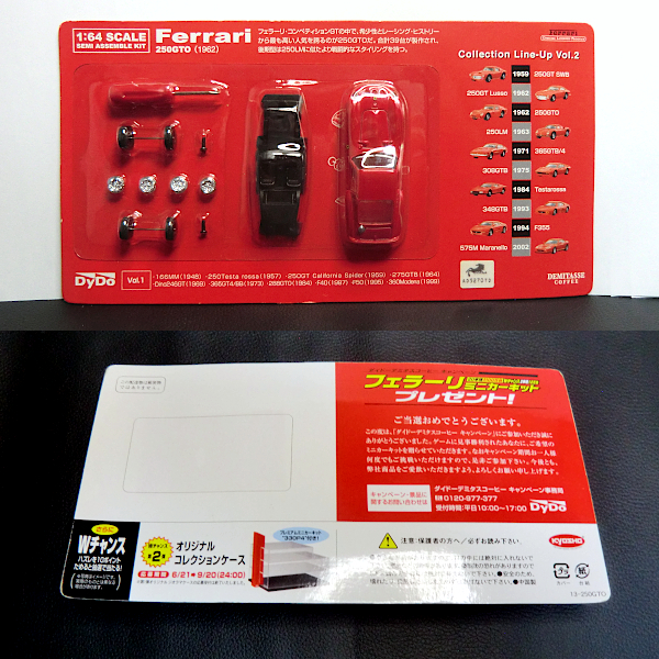 商品、ご覧いただき誠にありがとうございます。 ■商品名:ダイドー フェラーリ 250GTO(1962) 2003年にDyDoの缶コーヒーに付いているシールの番号を携帯電話から入力すると抽選が行われ 、当選するとフェラーリミニカーキットがもらえるキャンペーン。 1/64のスケールでフェラーリのライセンス品であり、製作は京商です。 ■状態:長期保管品。未開封品です。パッケージは経年変化により変色キズ等あります。 ※写真のものが全てです。 ※キレイな状態だと思います。 ※厳格に商品状態を気にされる方は入札をお控えください。 ■キャンペーン商品:ダイドードリンコ デミタスコーヒーキャンペーン 第2弾 ■製作:京商 ■スケール: 1/64 ■パッケージサイズ:横幅 約238mm × 縦 124mm ■重さ:60g |