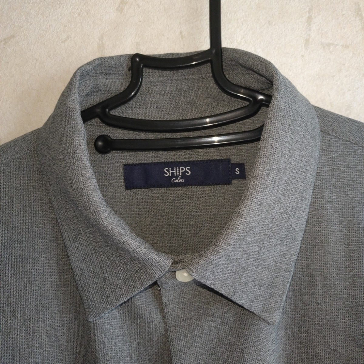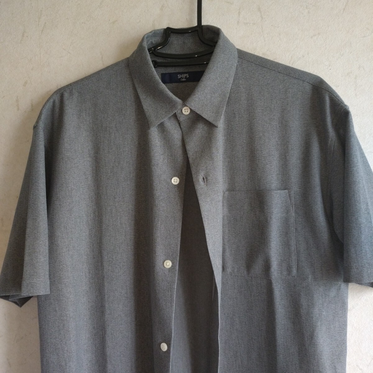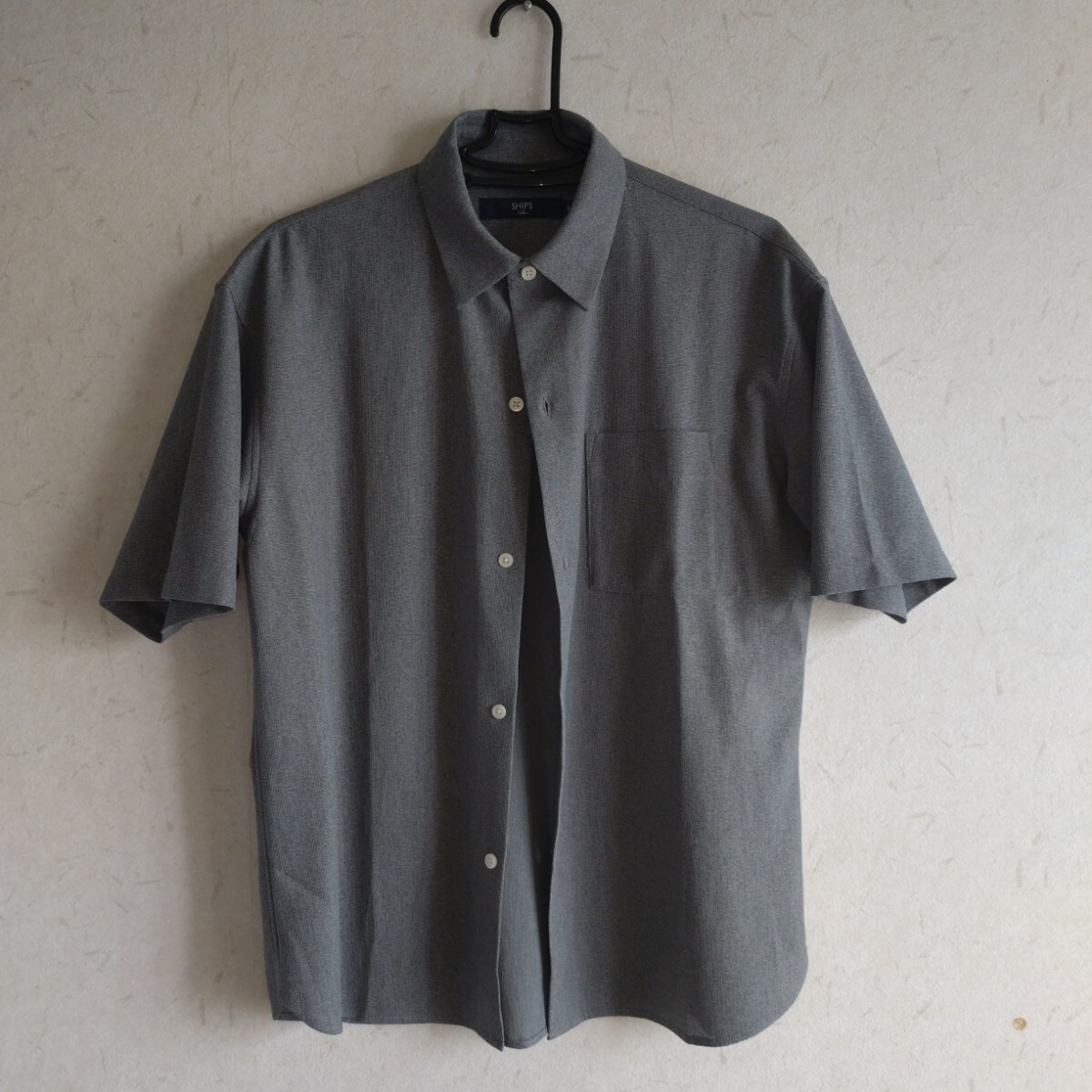 グレーの半袖シャツ、SHIPS製、Sサイズ、ポケット付き。ビッグシルエットのポリエステルのメッシュ素材でかつ洗濯できてシワがつかないシャツです。