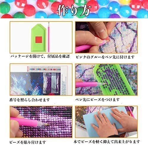 【作り方は簡単】ペン先をピンクのグルーを付けて台紙にビーズと同じ記号または英数字を貼り付けるだけでキラキラなダイヤモンドアートが仕上がります。クロスステッチ刺しゅうより気軽になり、集中力がUP、達成感もじゅうぶん味わっていただけます。