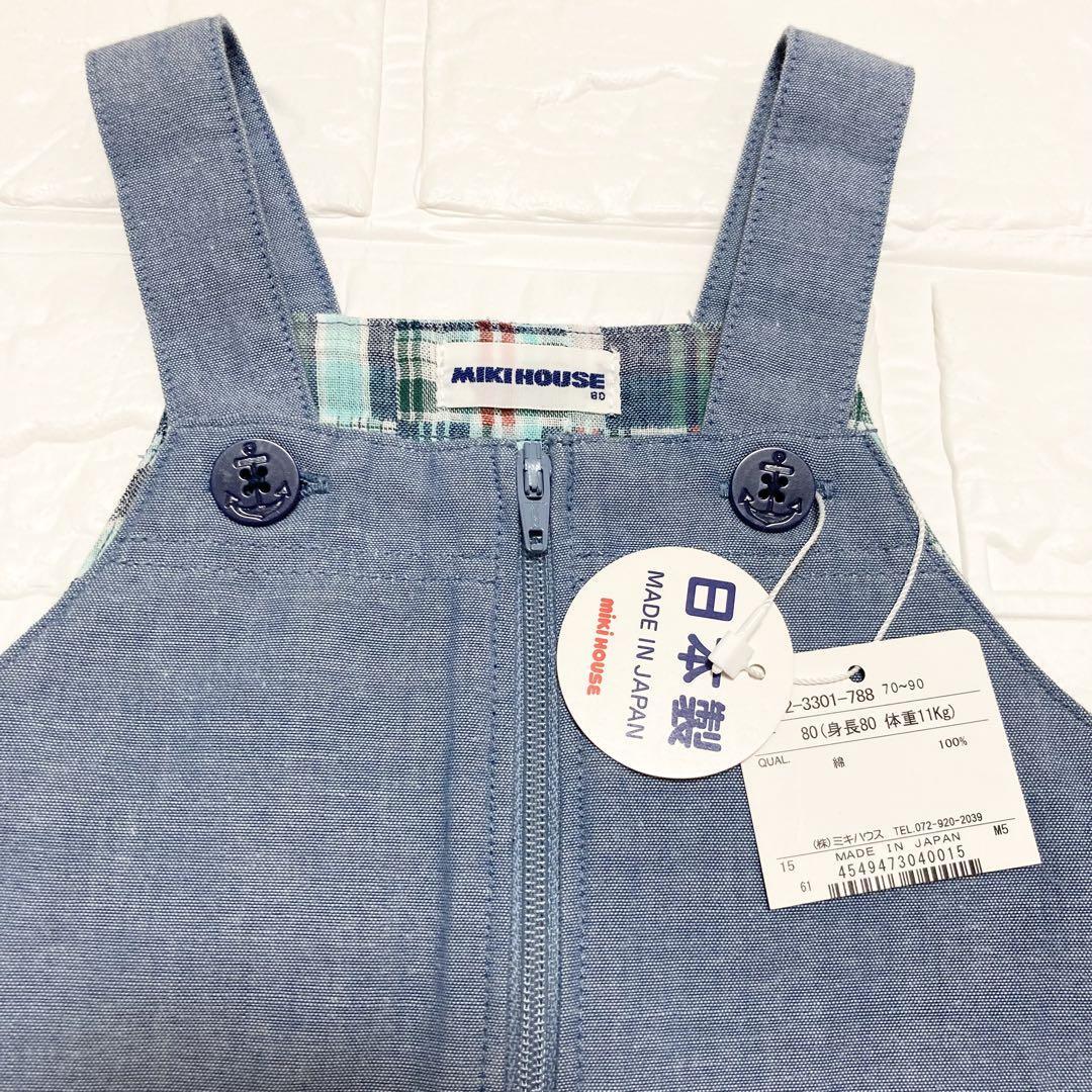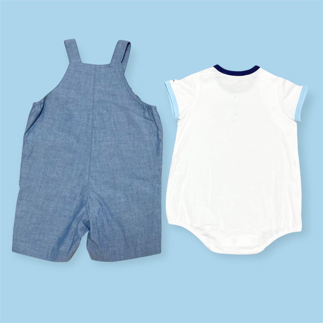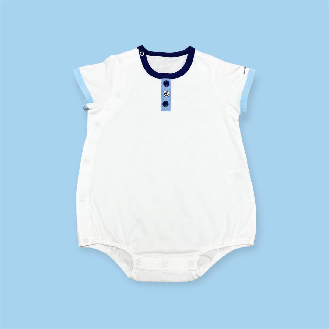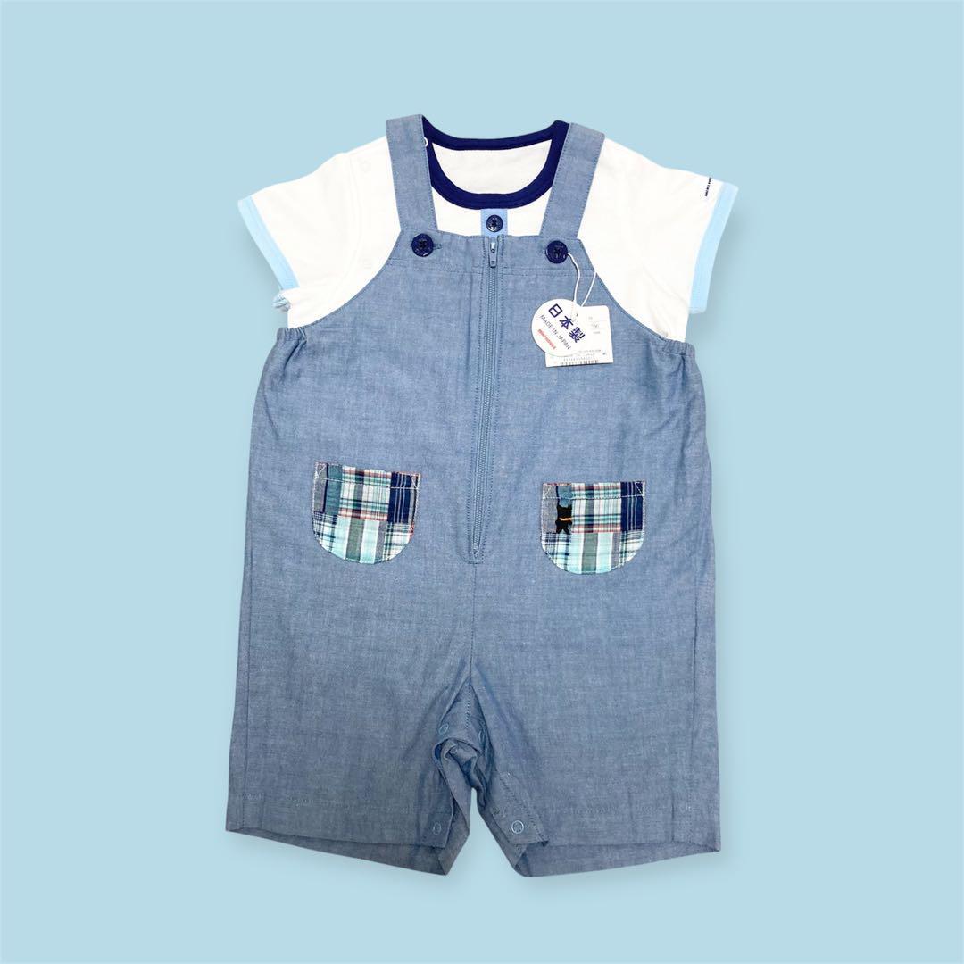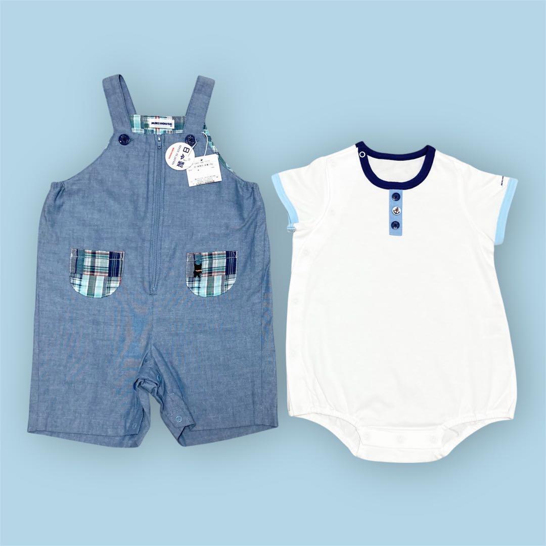 【新品未使用タグ付き】MIKI HOUSEのとても可愛いマリンテイストな夏用オーバーオールとカバーオールの2点セットです。ポケットの所にくまの刺繍があります。
