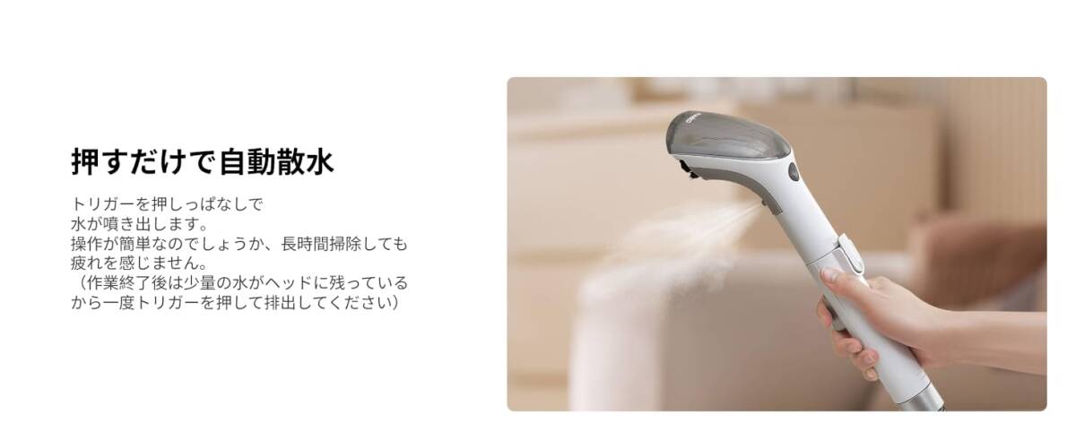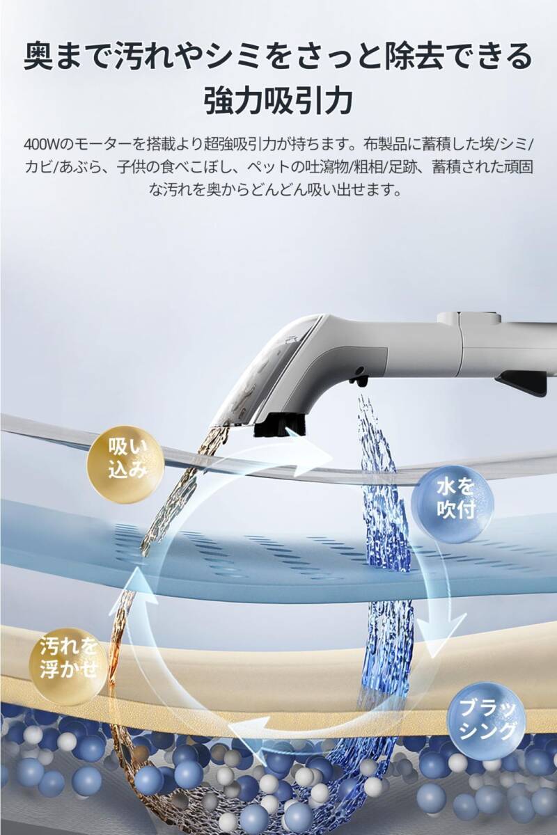 400Wのモーターを搭載より超強吸引力が持ちます。布製品に蓄積した埃/シミ/カビ/あぶら、子供の食べこぼし、ペットの吐瀉物/粗相/足跡、蓄積された頑固な汚れを奥からどんどん吸い出せます。