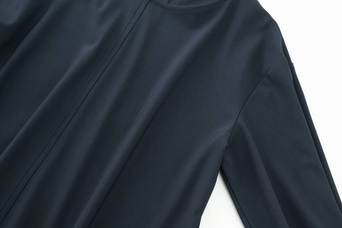 肩線を落としたリラックスシルエットで、体のラインを拾いにくく快適な着心地。