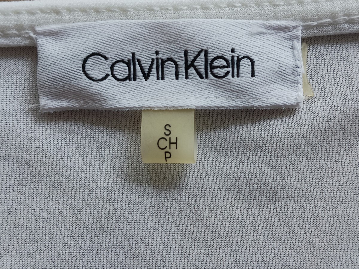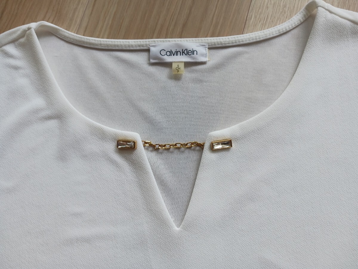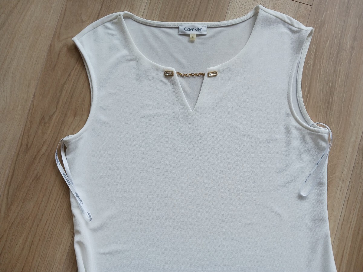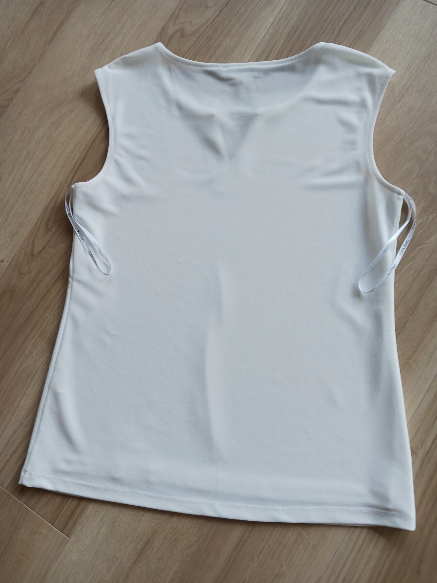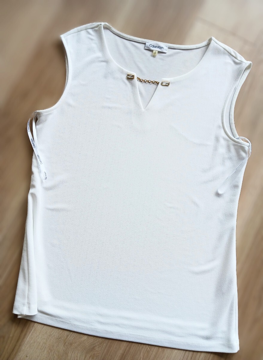 シンプルでエレガントなホワイトのノースリーブトップス、ゴールドの装飾が特徴。