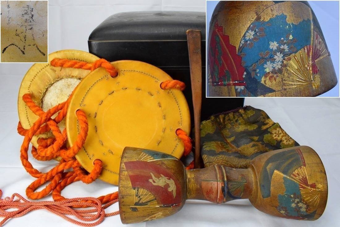 希少 江戸時代 大鼓胴 彩色時代蒔絵 大皮(重政 花押)皮 時代黒塗大鼓箱 時代和楽器 雅楽神楽 H332-2 |