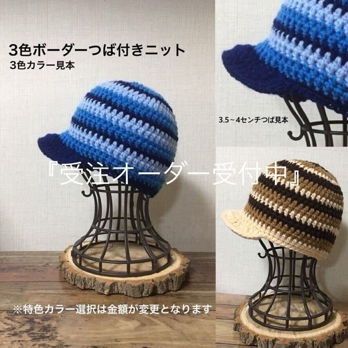 こちらは見本試作品のようにシンプルな3色柄のハンドメイドニット帽となります。記載よりお好きなカラーとサイズを選択して頂きフルオーダーで作らせていただきます。