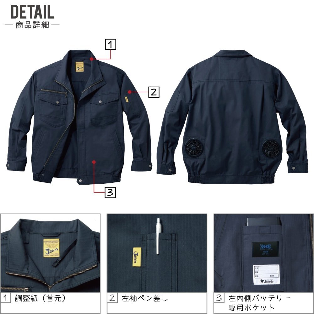 | 空調服説明 & 状態 & 素材 & サイズ & カラー 【画像参照】 | 届いてすぐにお使いいただけるおすすめセット商品! ■空調服 ≪説明≫ カジュアルな印象のシャドーストライプ素材。 Jawinの売れ筋商品 55200のデザインをベースにした空調服。 ≪状態≫ 新品・正規品 ≪素材≫ ポリエステル65% 綿35% シャドーストライプサマーツイル ≪特徴≫ ・調整ヒモ ・左袖ペン差し ・左内側バッテリーポケット ・右胸ファスナーポケット ・金属ボタン ・金属ファスナー ≪素材特徴≫ ・帯電防止 ≪サイズ≫ タイトル名【 画像参照 】 ≪カラー≫ タイトル名【 画像参照 】 | セット 内容 | ■14.4Vバッテリーセット ≪内容≫ ・14.4Vバッテリー×1 ・バッテリーケース×1 ・急速AC充電アダプター×1 出力:14.4V、11V、8.2V、6V 出力切替:ターボモード、11V連続モード、11Vゆらぎモード、8.2V、6V 定格容量:3250mAh(46.8Wh) 重量:287g 連続使用時間 14.4V設定時:約4.9時間 11V連続モード設定時:約4.4時間 11Vゆらぎモード設定時:約6.8時間 8.2V設定時:約8.5時間 6V設定時:約17時間 ※ターボモードとは、14.4Vで5分間動作し、その後10.5Vへ自動移行するモードです。再度、ターボモードをご使用になる際には30分間のインターバルが必要です。バッテリー残量“6”以上の時のみ使用可能です。 ※ゆらぎモードとは、出力電圧11.0Vと8.2Vを一定の間隔で自動で切り替え、11V連続モード時に対しバッテリーの持ち時間を延ばすモードです。 ■ターボモード対応ファンセット ≪内容≫ ・ターボモード対応ファン×2(ブラック) ・ケーブル×1 風量 14.4V設定時(ターボモード):76.0リットル/秒 11V設定時:62.0リットル/秒 8.2V設定時:48.8リットル/秒 6V設定時:36.0リットル/秒 ※既存品との互換性はありません ■:本商品の【 サイズ・カラー 一覧(服単品) 】 ■:本商品の【 フルセット(服+バッテリー+ファン) 】 ■:本商品の【 ファンセット(服+ファン) 】 ■:本商品の【 大風量フルセット(服+大風量対応バッテリー+パワーファン) 】 ■:本商品の【 14.4Vフルセット(服+14.4Vバッテリー+ターボモード対応ファン) 】 ■:本商品の【 備品 一覧 】 □:綿100% 空調服 一覧 □:ポリエステル100% 空調服 一覧 □:フルハーネス 空調服 一覧 |