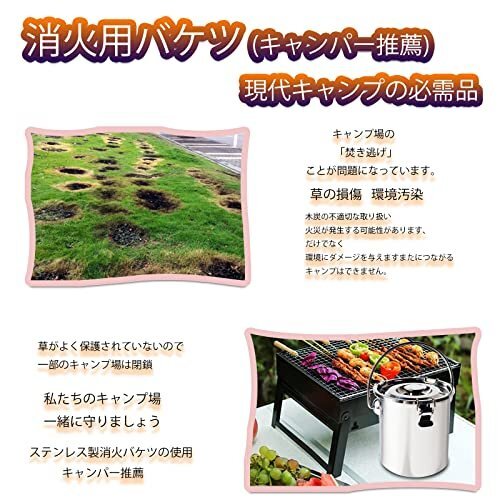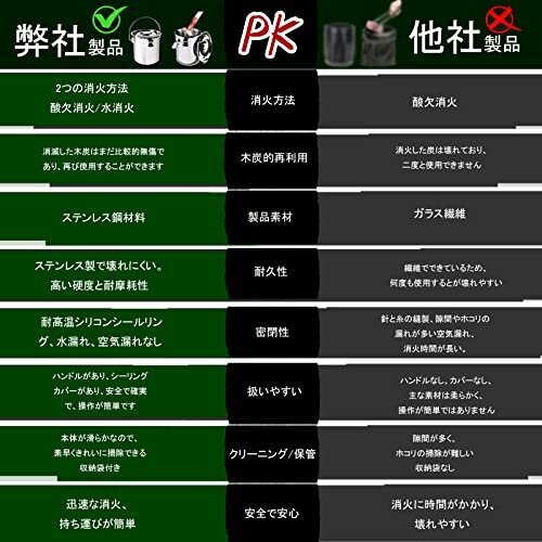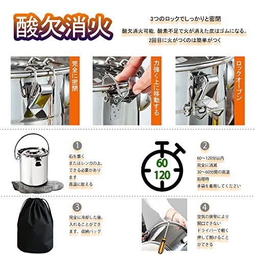 ②機能メリット:3つのロックが蓋を閉めることができ、蓋を閉める時にステンレスチャコール樽の密封性が未燃焼済の炭を酸素遮断し、無酸素状態に達すると消灯します。冷水を入れると炭を素早く冷温すると消灯状態にできます。またバケツ内は燃えないチャコールは、キャンプや焚き火泊り、炭が必要な場合でも再利用でき、無駄を拒否します。ステンレススチール製のチャコールバケツは水に濡れても錆びにくく、何度でも使えるので経済的です。