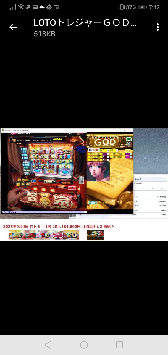 2025年9月4日 ロト6 1等 194,184,800円 1点目ナビ3 当選♪