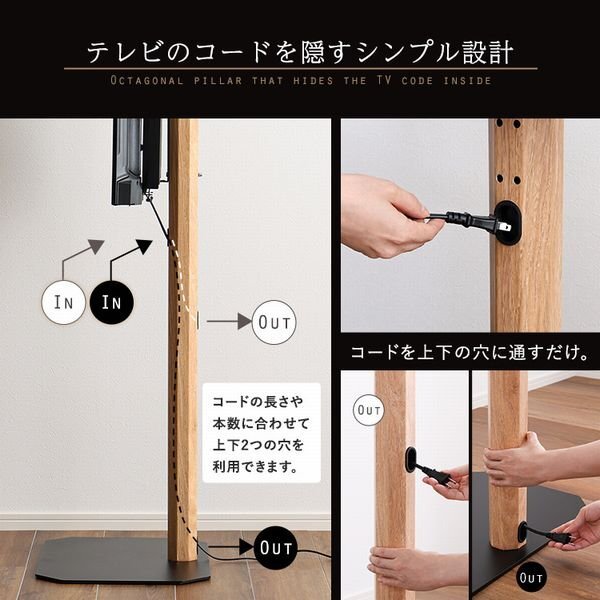 ヴィンテージカラー(ウォールナット、シャビーオーク)をスチール支柱に 木目を転写したスタイリッシュなデザインの八角テレビスタンド ハイタイプです。 ブラック×木目のオールスチール素材はインパクトがあり、お部屋の雰囲気がガラッと変わります。 ハイタイプなので、会議の打ち合わせやイベントでも大活躍すること間違いなしです。 支柱内部にコードを通す穴が空いているので、スッキリ見せれます。 240度のスイングタイプで32?65インチのテレビを取付できます。 高さは3段階調整可能でお好みの高さに設定できます。 |
