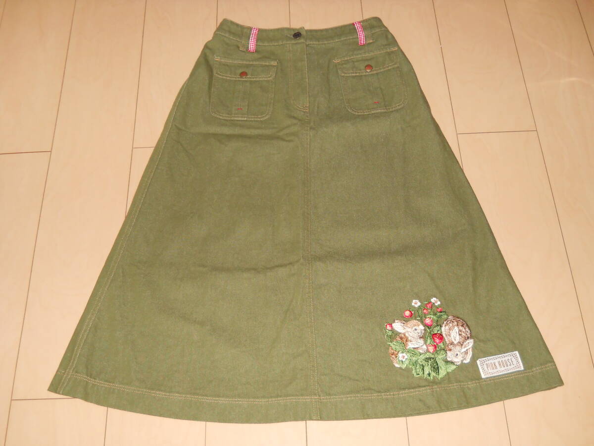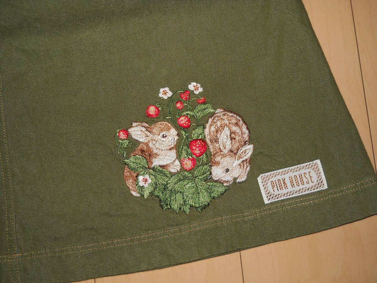 着丈77㎝。ウエスト40×40㎝。後ろゴム入り。2回だけ短時間着用なので状態は良いです。これから秋~冬にピッタリのお色目です。2匹にうさぎの刺繍も豪華です。