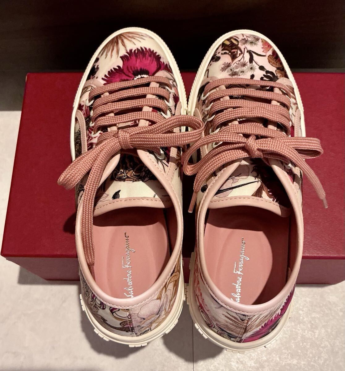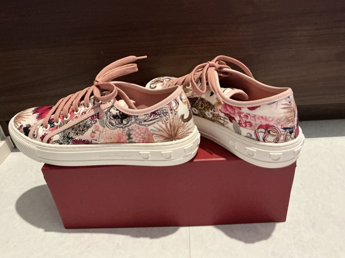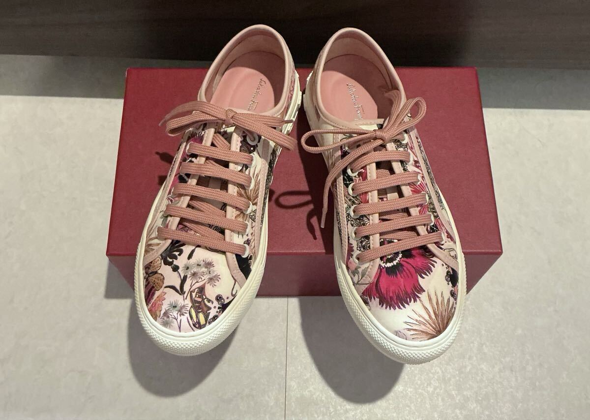 定価 106,700円。 フェラガモのスカーフ柄が美しいスニーカーです。