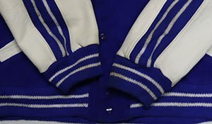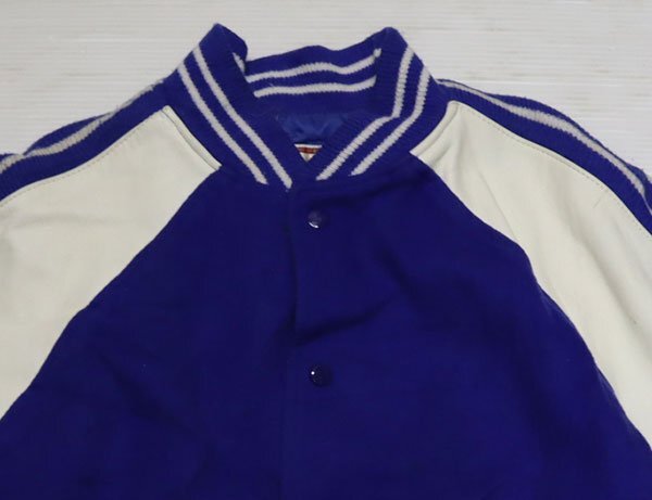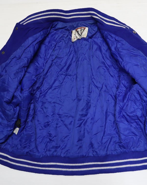 アメリカ買い付けのアメリカ製の袖Xポケット縁革スタジャンの青系xアイボリー系の裏地内装はナイロンキルテングの中綿入りです。