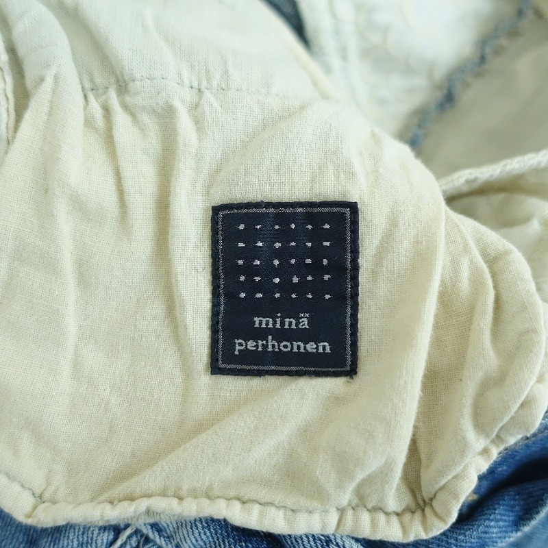 | mina perhonenのalways ダメージ加工デニムパンツです。カラーはインディゴブルーのセルビッチデニム素材で、ユーズド加工やダメージ加工が施されております。フロントボタン開閉式で、ウエスト&ヒップの左右両サイドの計5か所にポケットがあり、バック右腰にパッチがあしらわれております。ウエスト内側とポケット袋布の一部に「mermaid」のテキスタイル刺しゅうが施されております。 |