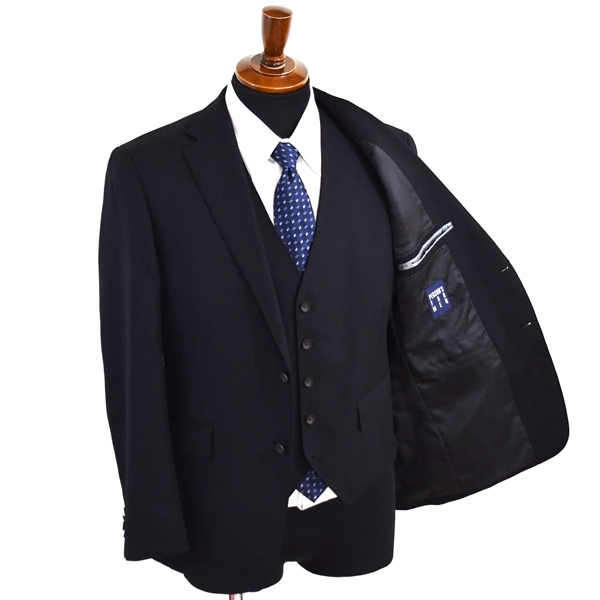 ・春夏秋対応。ベスト付き。2つボタンシングル。袖口4つ釦開き見せ。背抜き。センターベント。フラップポケット。ネーム刺繍なし。
