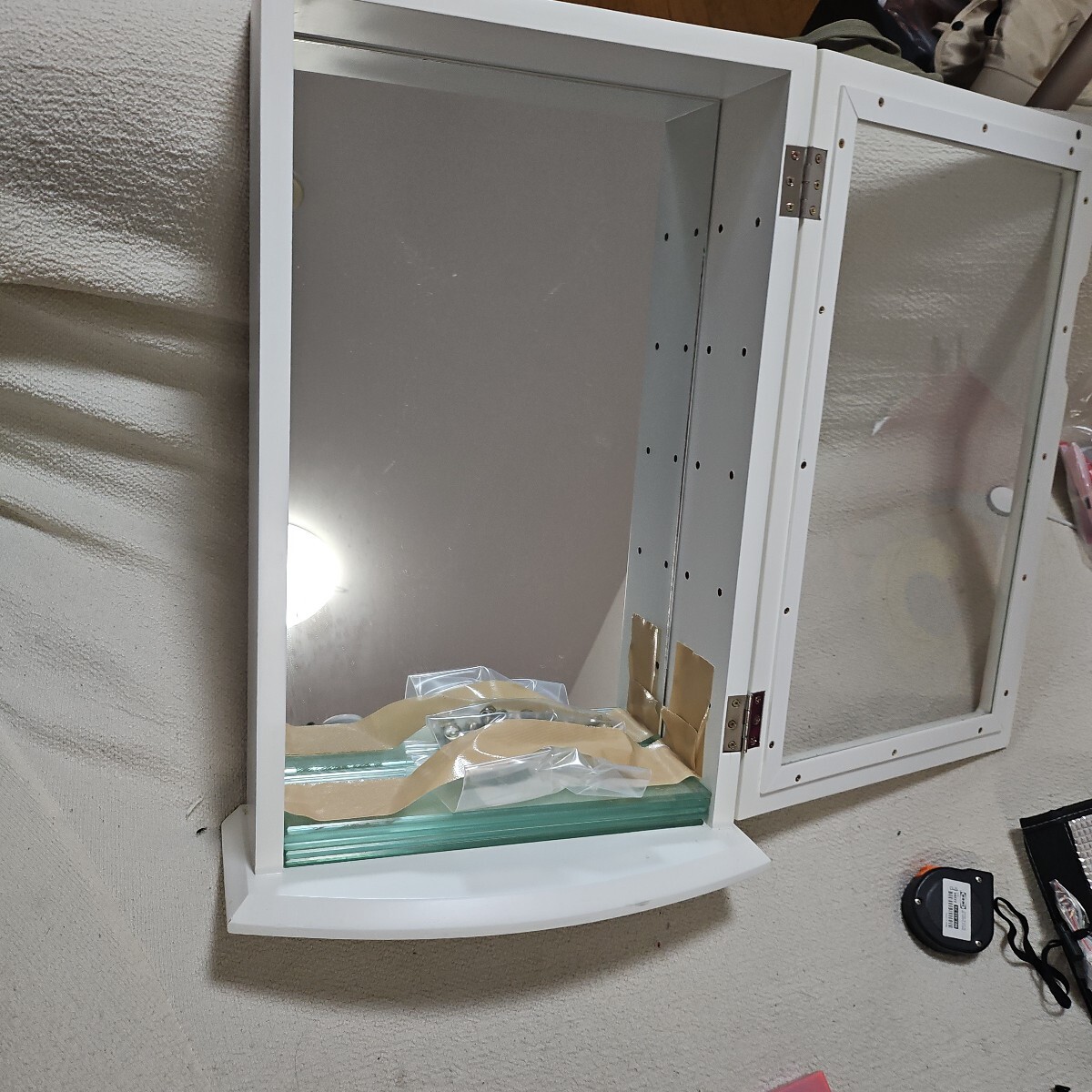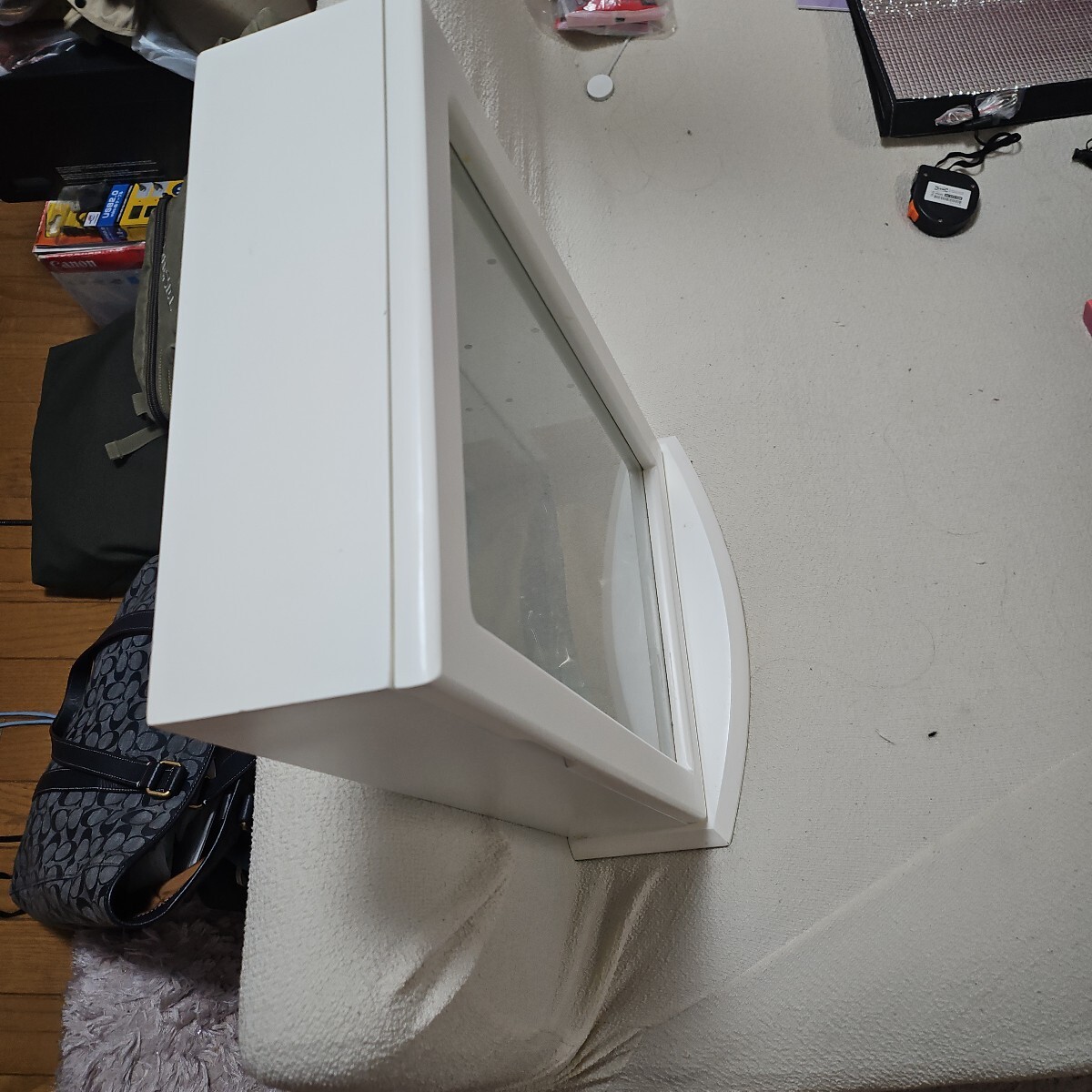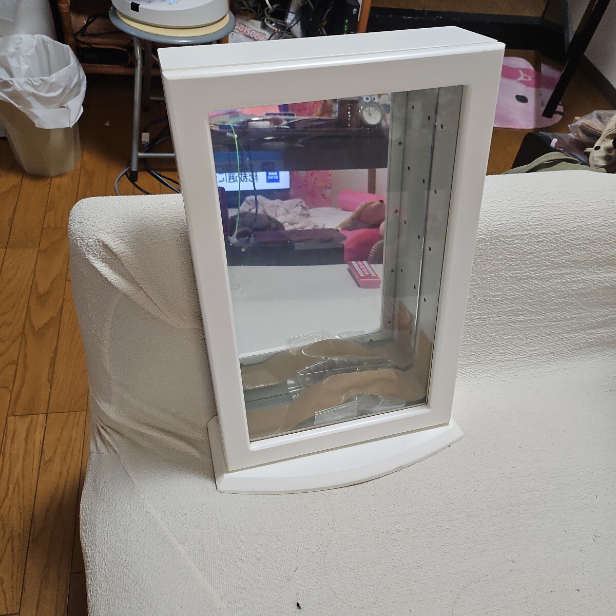 背面が鏡になっているホワイトのジュエリーケースです。ガラス製の扉と、ガラス製のしきり棚がつきます。サイズは高さ48cm 幅 30cm奥行き15cm です。大切なジュエリーの保管にいかがでしょうか?