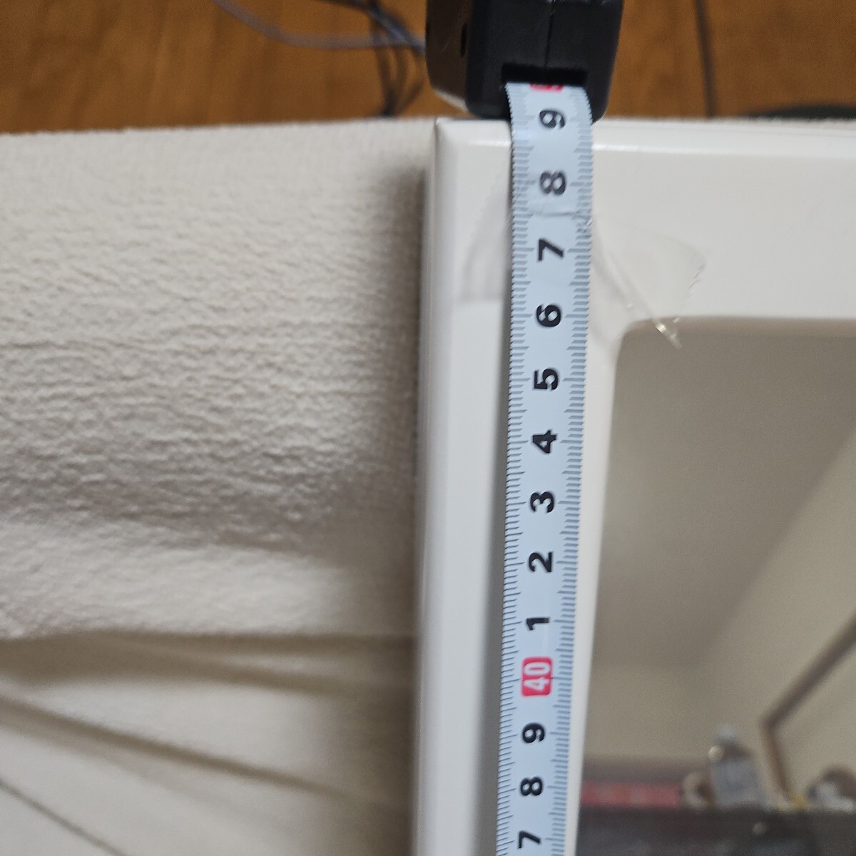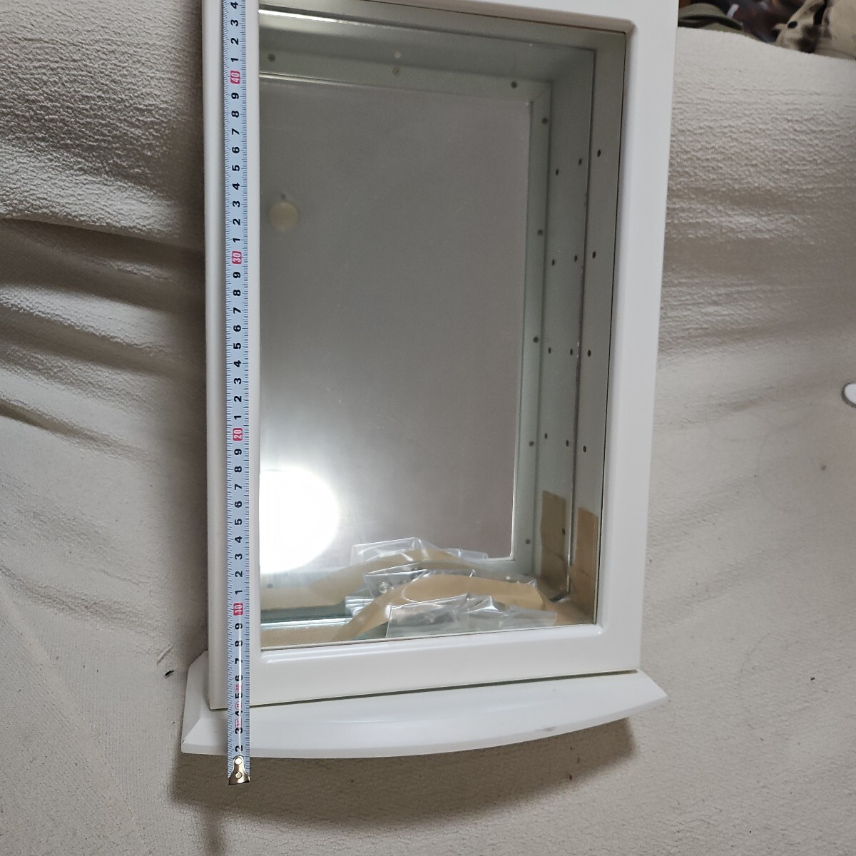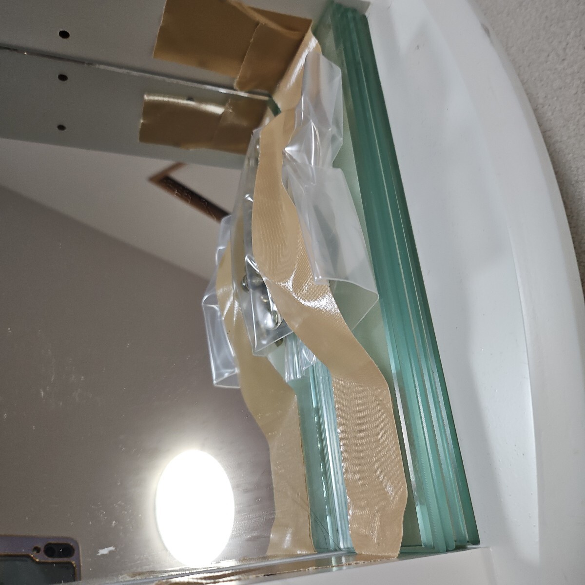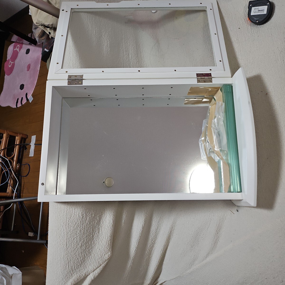 背面が鏡になっているホワイトのジュエリーケースです。ガラス製の扉と、ガラス製のしきり棚がつきます。サイズは高さ48cm 幅 30cm奥行き15cm です。大切なジュエリーの保管にいかがでしょうか?