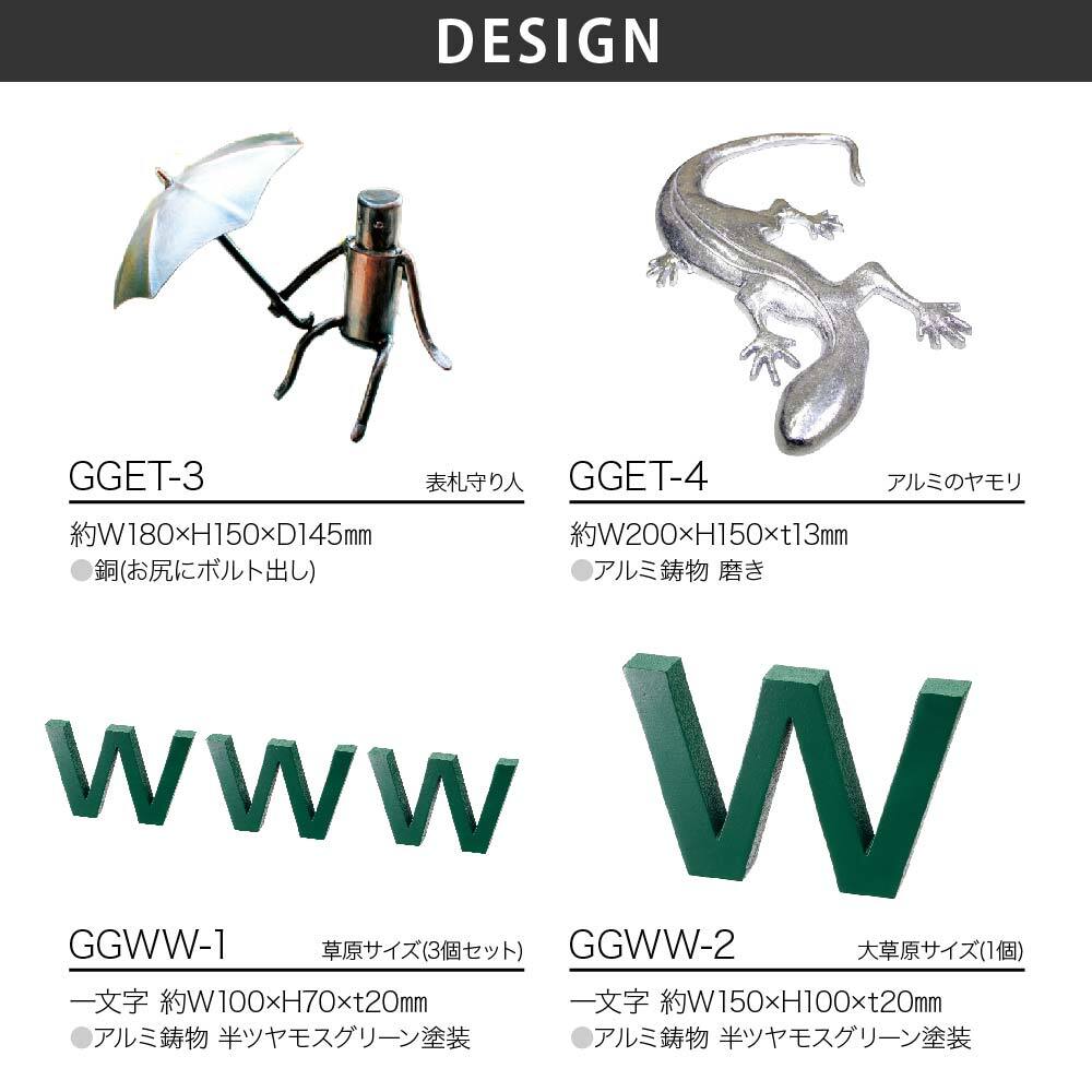 商品仕様 | 【庭の草・大草原サイズ GGWW-2】 約W150×H00×t20mm 【庭の草・草原サイズ3個セット GGWW-1】 一文字 約W100×H70×t20mm 【隊長のピンチ GGTK-1】 キャラ部分:約W50×H100mm 【はしごを登る隊員 GGTK-2】 キャラ部分:約W120×H100mm 【ピンコロマン GGET-1】 約W60×H200mm 頭φ22 【ピンコロカップル GGET-2】 約W60×H200mm 頭φ22 【表札守り人 GGET-3】 約W180×H150×D145mm 【アルミのヤモリ GGET-4】 約W200×H150×t13mm |