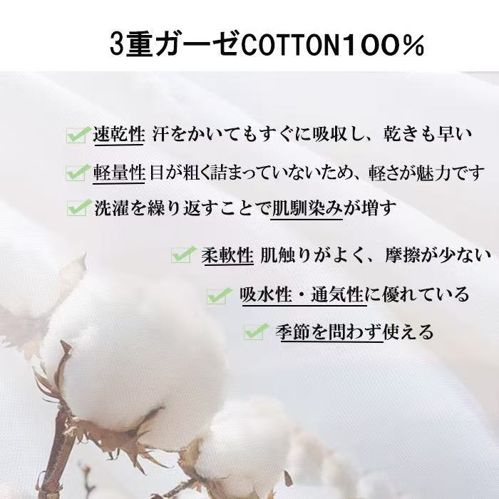 ■【100%綿三重がーぜ】 やわらかくて優しい肌触りのガーゼを三層に織上げ,丈夫と軽いです。 空気を含んでふっくらと仕上げました。内側に空気の層が出来き、吸湿と通気性と発散性もよくできます。 夏は涼感がありさらりと冬は体温を保って快適にご使用いただけます。 お洗濯するたびにふんわり感が、増やす、肌へのなじみがよくいきます。 ふんわりと心地よくなる特徴があります。