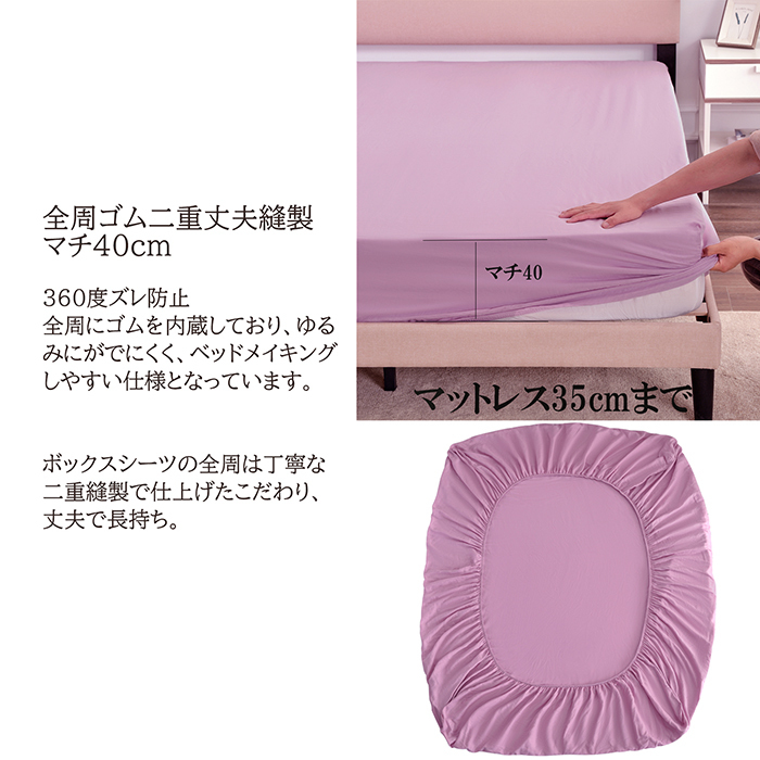 ■全周ゴム 二重丈夫縫製マチ40cm 360度ズレ防止 ボックスシーツの全周は丁寧な二重縫製で仕上げたこだわり、丈夫で長持ち。一般的にマチ部分30cmではなく、マチ部分40cmです。