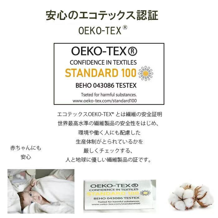 ■【エコテックス認証 OEKOーTEX】繊維の安全証明「エコテックス」 エコテックスは、世界最高水準の繊維製品の安全性をはじめ、 環境や働く人にも配慮した生産体制がとられているかを厳しくチェックする、 人と地球に優しい繊維製品の証です。 安全性や生産体制の環境、人への配慮などを含む厳密な審査を通った繊維製品に贈られる認証基準。