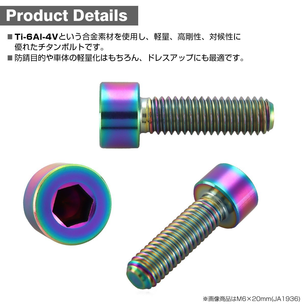 | 64チタン合金 スリムヘッド キャップボルト 金属の中でも軽量、高剛性、対候性に優れた64チタン合金(Ti6AI-4V)を採用。 ドレスアップにも最適なボルトです。 |